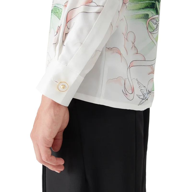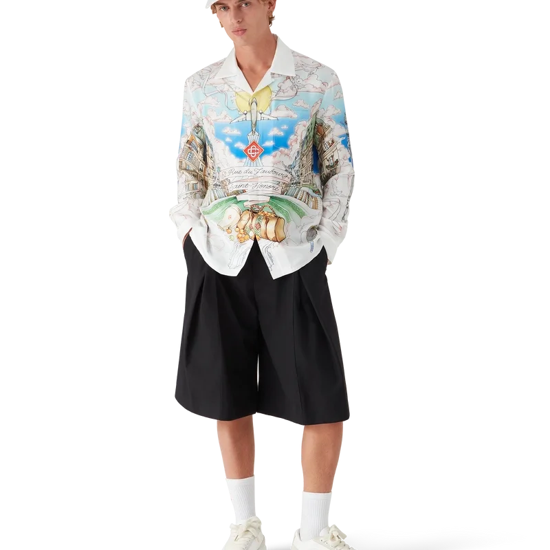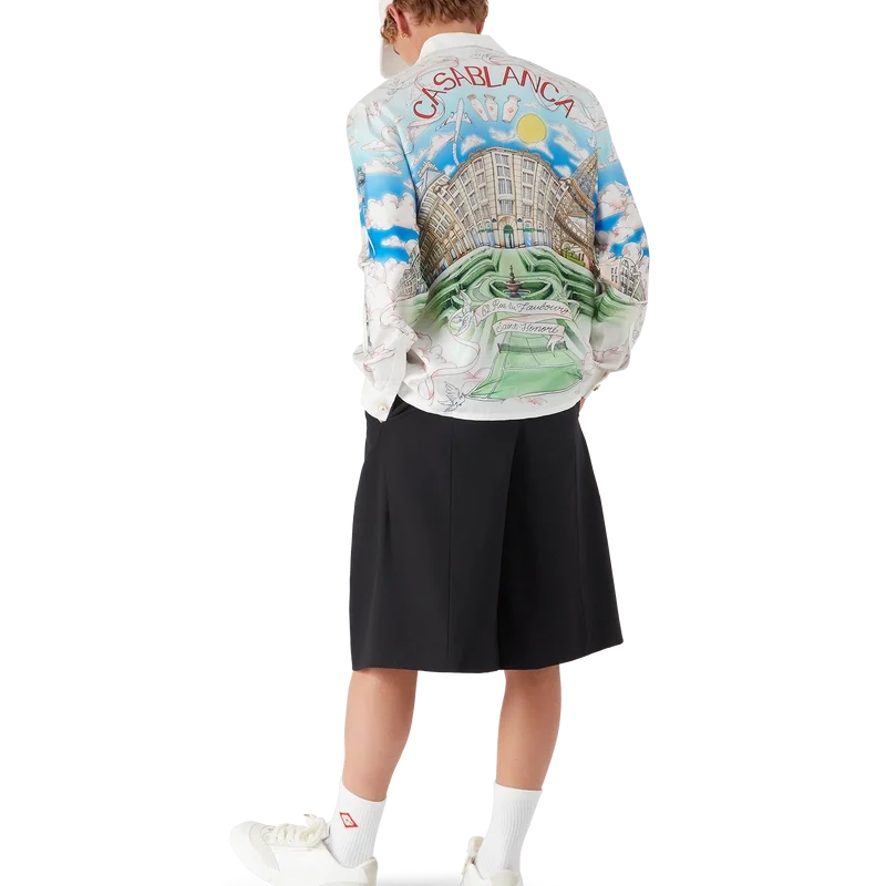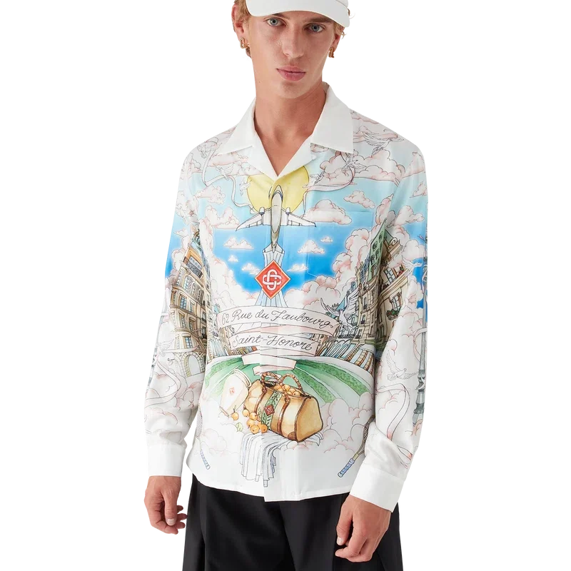 Das langärmelige Seidenhemd von La Vie Parisienne ist ein Modell mit Allover-Print, das exklusiv für unseren Flagship-Store entworfen wurde. Es zeigt Motive, die von Architektur, Tennis, Natur und Reisen inspiriert sind und unseren Pariser Store in der Rue du Faubourg Saint-Honoré darstellen – einer der weltweit geschichtsträchtigsten Straßen für Mode und Design und ein Symbol für französische Eleganz und Raffinesse. Abgerundet wird das Modell durch einen Kubanerkragen, einen Knopfverschluss, Corozo-Knöpfe mit dem ineinander verschlungenen Cc-Logo sowie emaillierte Knöpfe mit Goldrand an den Manschetten. Dieses Modell ist exklusiv auf Casablancaparis.Com und in unserem Pariser Store erhältlich.