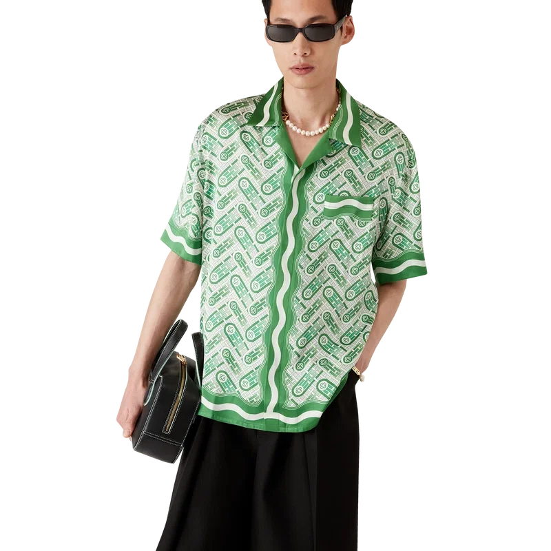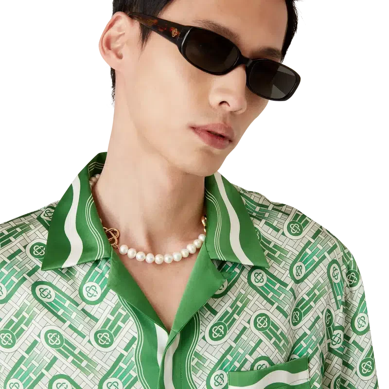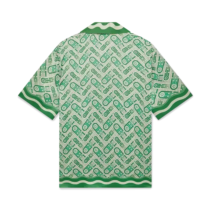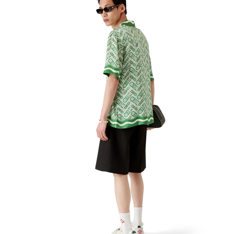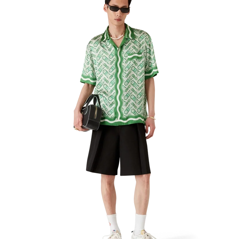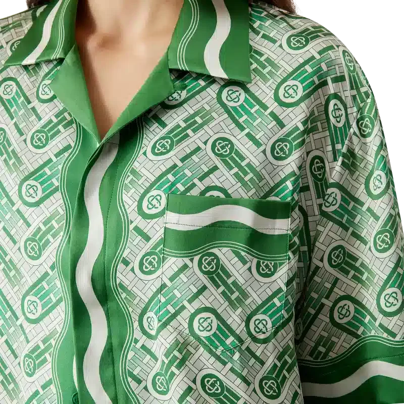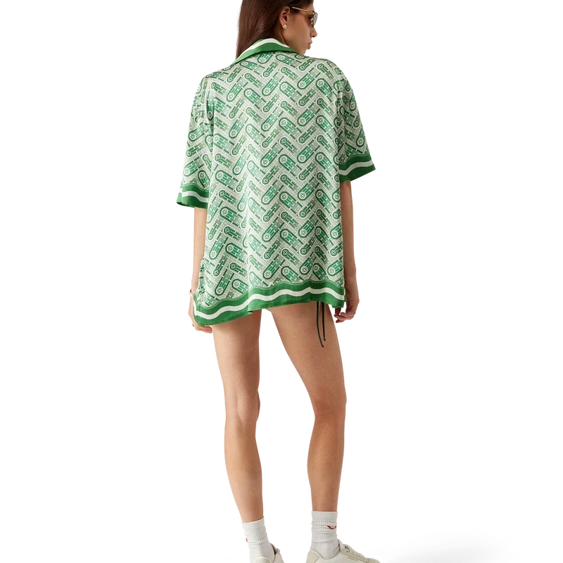 Das kurzärmelige Seidenhemd „Ping Pong“ ist ein Allover-Print-Design mit dem Ping-Pong-Ball des Hauses in Bewegung, der eine diagonale Bewegung durchführt, gefertigt aus Seidensatin. Abgerundet durch einen Kubanischen Kragen, verdeckte Knopfleiste, Corozo-Knöpfe mit ineinander verschlungenem Cc-Logo, eine Brusttasche sowie von der Memphis-Welle inspirierte Streifendetails an Kragen, Manschetten, Saum und Knopfleiste.