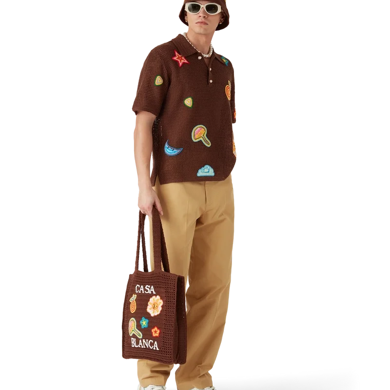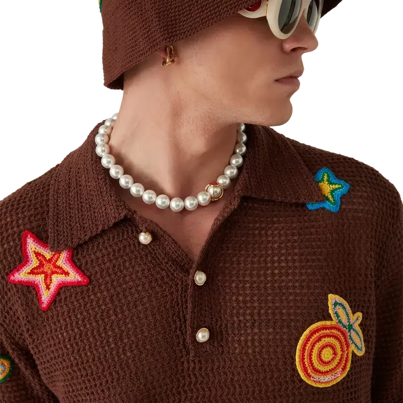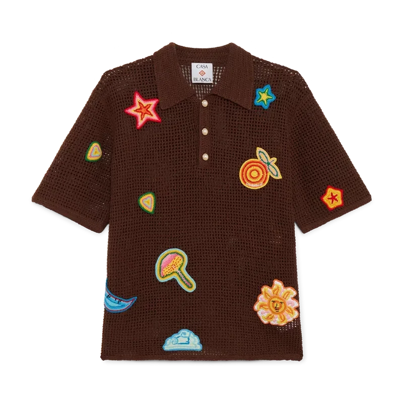 Das Poloshirt mit Häkelmotiv ist ein kurzärmeliges Modell aus gestricktem, merzerisiertem Baumwollstoff. Abgerundet durch Motive der klassischen Designelemente des Hauses, charakteristische Perlenknöpfe mit Goldrand sowie einen gerippten Kragen und Manschetten.