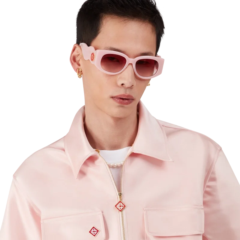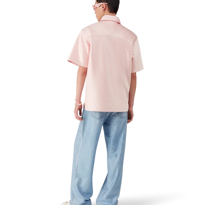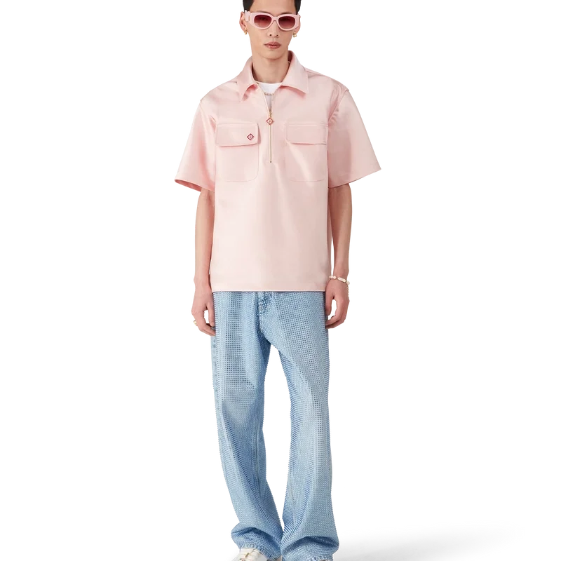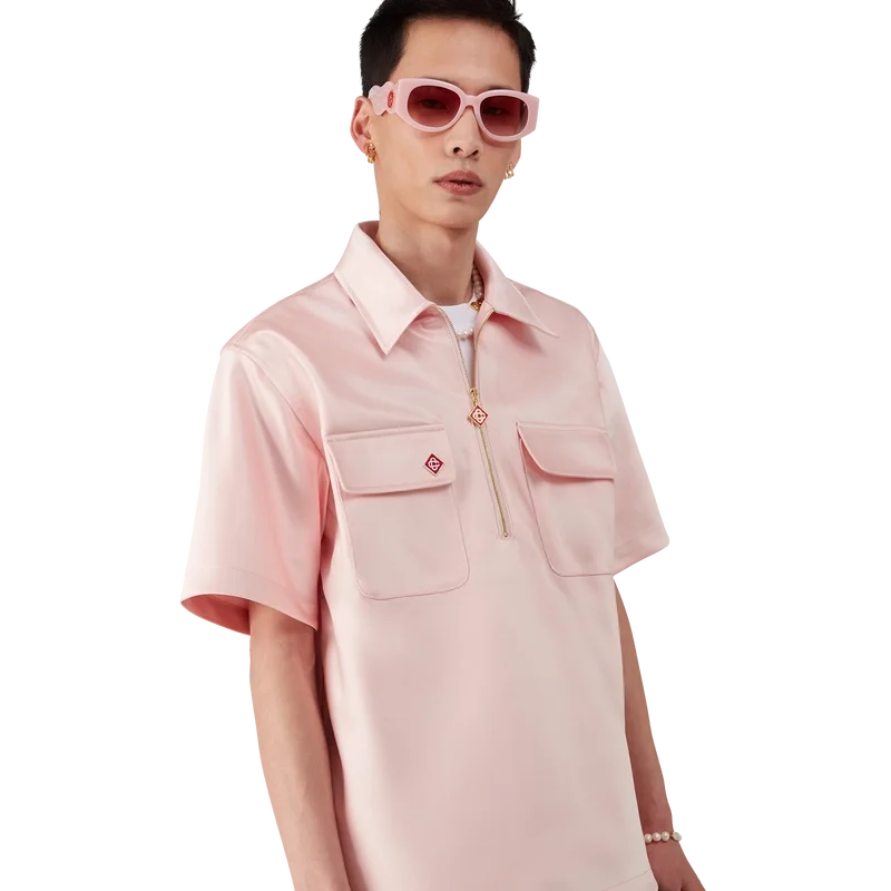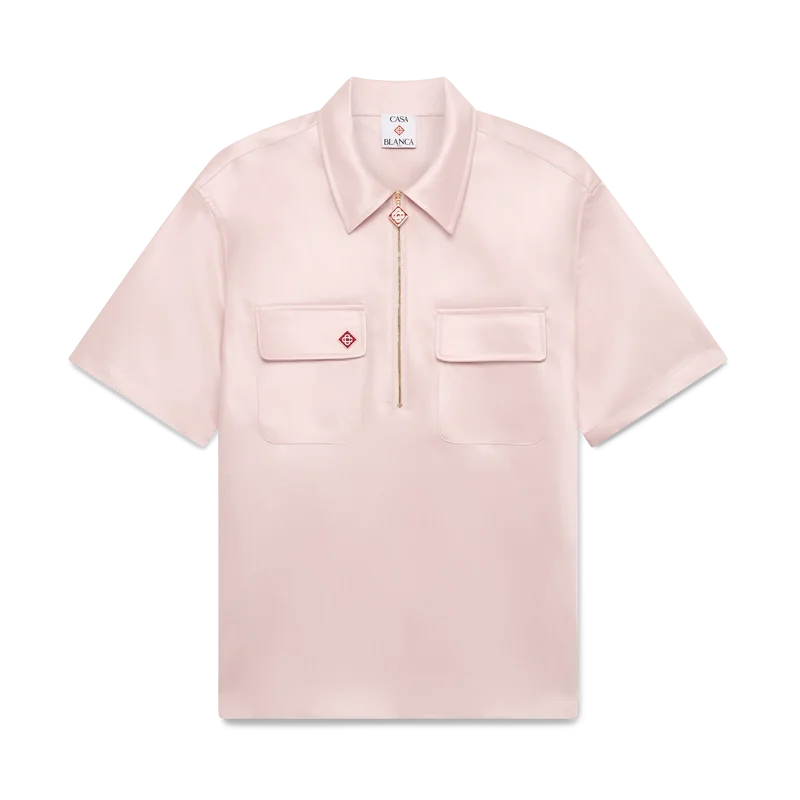 Das Satin-Shirt mit Viertelreißverschluss ist ein kurzärmeliges Modell aus Satin. Es verfügt über einen Reißverschluss mit dem charakteristischen Rautenlogo des Hauses, einen Kragen sowie aufgesetzte Pattentaschen.