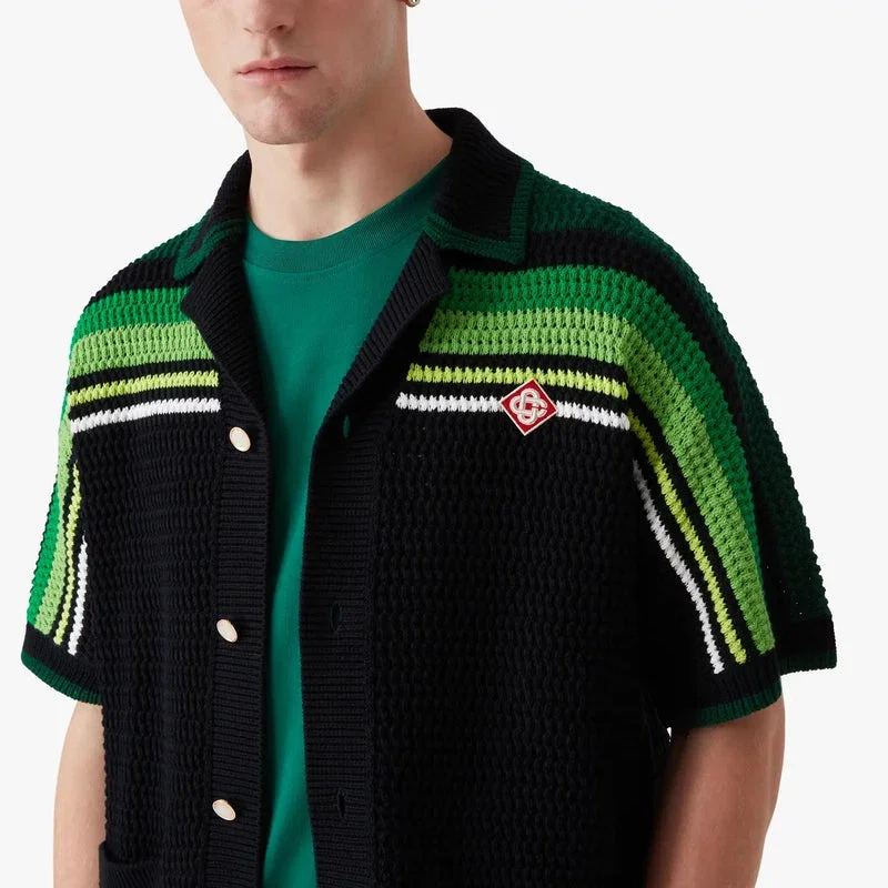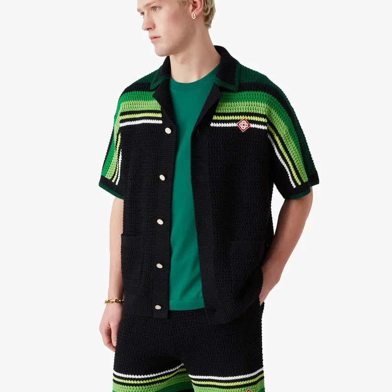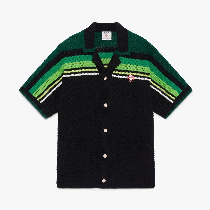 Das schwarz-grün gestreifte Kurzarm-Polohemd besticht durch ein raffiniertes Häkel-Design mit dem charakteristischen Diamant-Logo des Hauses sowie grünen und limettenfarbenen Streifen auf Schultern, Brust und Ärmeln. Abgerundet wird der Look durch gerippten Kragen, Manschetten und Saum, einen Knopfverschluss vorne, aufgesetzte Taschen vorne und die charakteristischen goldgerahmten Perlenknöpfe.
