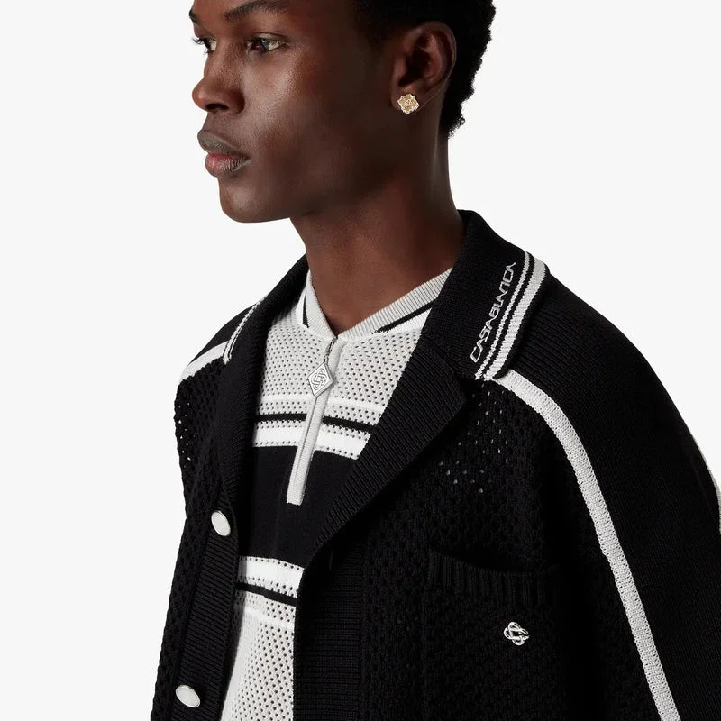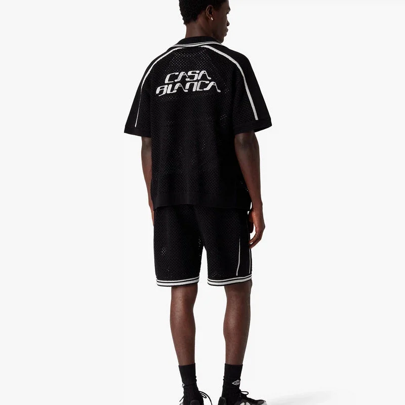 Das schwarze Kurzarm-Mesh-Hemd besticht durch sein raffiniertes Design, das den gehobenen Anspruch des Hauses an Freizeitmode verkörpert. Es verfügt über Streifenverzierungen an den Schultern und entlang der Ärmel, einen Kragen im kubanischen Stil mit gestreiften Kanten, einen Knopfverschluss, charakteristische silberrandige Emaille-Knöpfe sowie eine Brusttasche mit dem versilberten, ineinander verschlungenen „CC“-Logo-Nieten des Hauses.