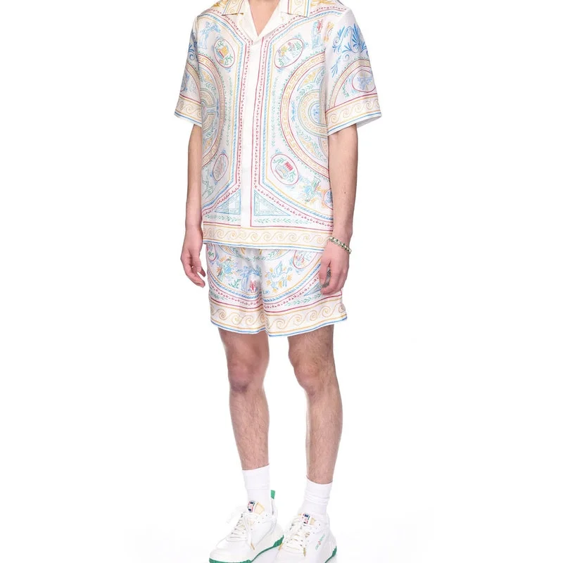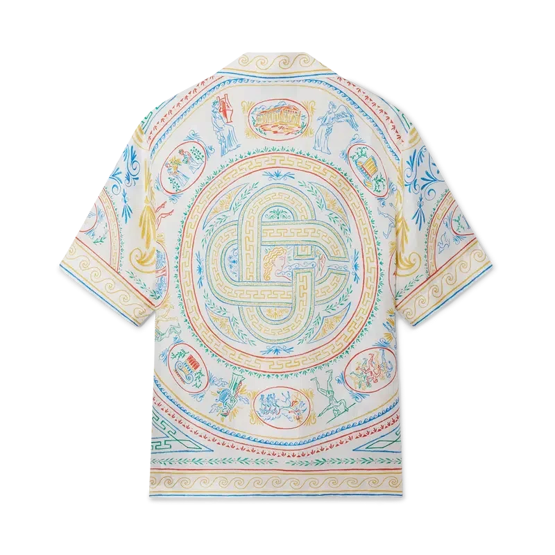 Das Crayon Vase-Seidenhemd ist ein mehrfarbig bedrucktes Design aus Seidentwill, das saisonale Kunstwerke zeigt, inspiriert von einem klassischen griechischen Teller-Layout mit den Designcodes des Hauses. Abgerundet wird es durch einen Kubanerkragen, einen Knopfverschluss, charakteristische Cc-Logo-Corozo-Knöpfe sowie die saisonalen griechischen Wellen- und Streifen-Kantenverzierungen an Kragen, Manschetten und Saum.
