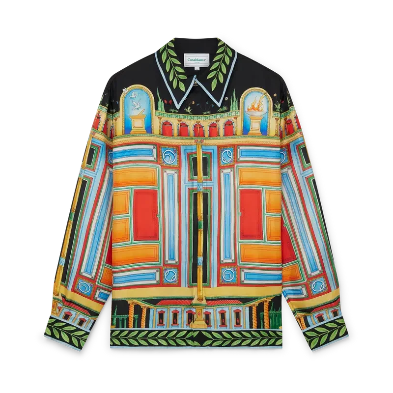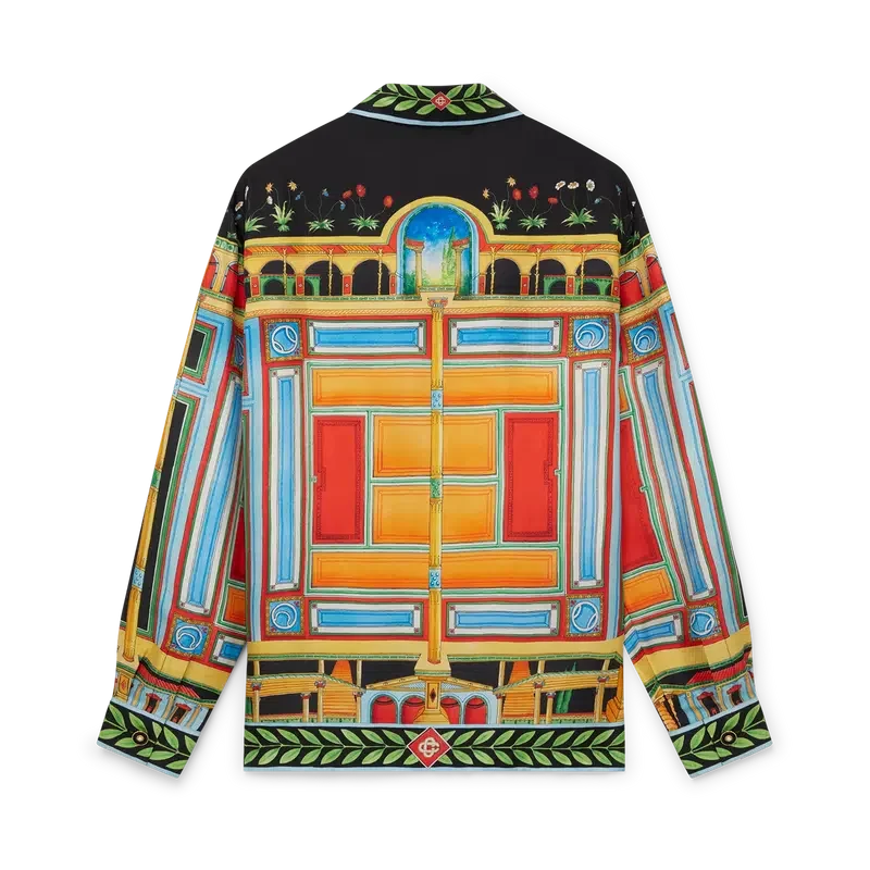 Das Seidenhemd „Le Palais En Fleur“ ist ein langärmeliges Modell mit durchgehendem Druck, das saisonale Motive zeigt, die von der Architekturgeschichte Pompejis, seinen lebhaften Farben und seiner Symmetrie inspiriert sind. Es ist aus Seidentwill gefertigt. Abgerundet wird es durch die für das Haus typischen, goldumrandeten Perlmuttknöpfe, einen Knopfverschluss, einen kubanischen Kragen und das charakteristische Lorbeerblatt-Motiv an Manschetten, Saum, Kragen und Knopfleiste.