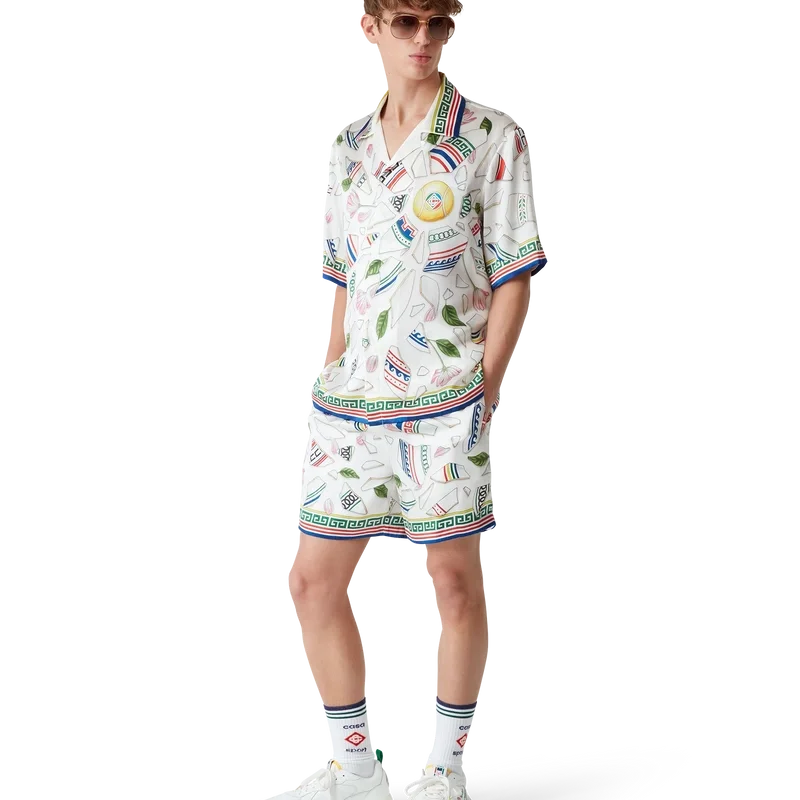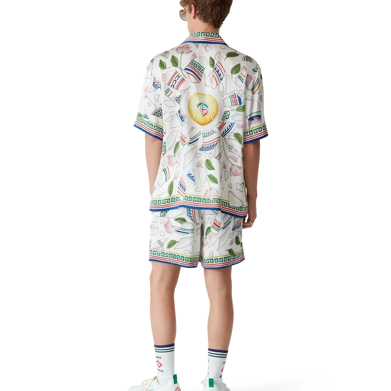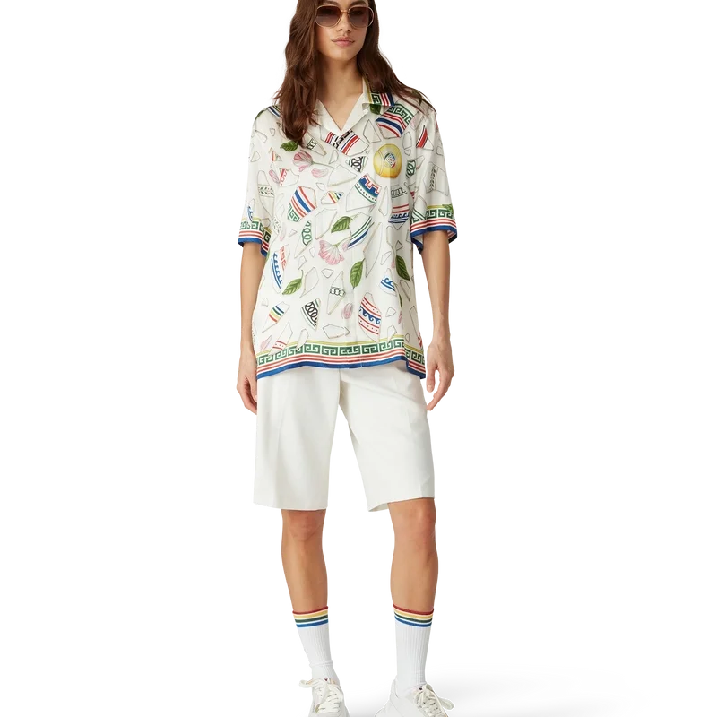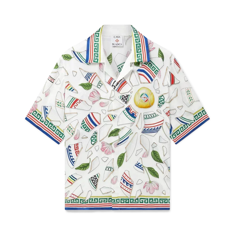 Das Seidenhemd „Le Vase Brise“ ist ein kurzärmeliges Modell mit durchgehendem Druck, gefertigt aus Seidensatin mit dem saisonalen Print des Hauses, inspiriert von der fortwährenden Auseinandersetzung mit der klassischen Schönheit und zeitgenössischen Anziehungskraft des antiken Griechenlands. Abgerundet durch charakteristische Corozo-Knöpfe mit dem ineinander verschlungenen CC-Logo, Knopfleiste, einen kubanischen Kragen und von griechischen Mustern inspirierte Details an Manschetten, Kragen und Saum.