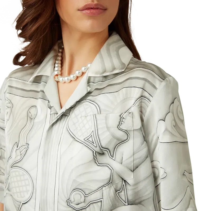 Das Seidenhemd „Sacred Stone“ ist ein kurzärmeliges Modell mit Allover-Print aus Seidensatin, das mit dem saisonalen Kunstwerk des Hauses verziert ist, inspiriert vom Steineffekt des Trompe-l’œil mit leichten Zeichnungen. Abgerundet durch einen Kubanerkragen, einen Knopfverschluss und ineinander verschlungene CC-Logo-Knöpfe aus Corozo<!–