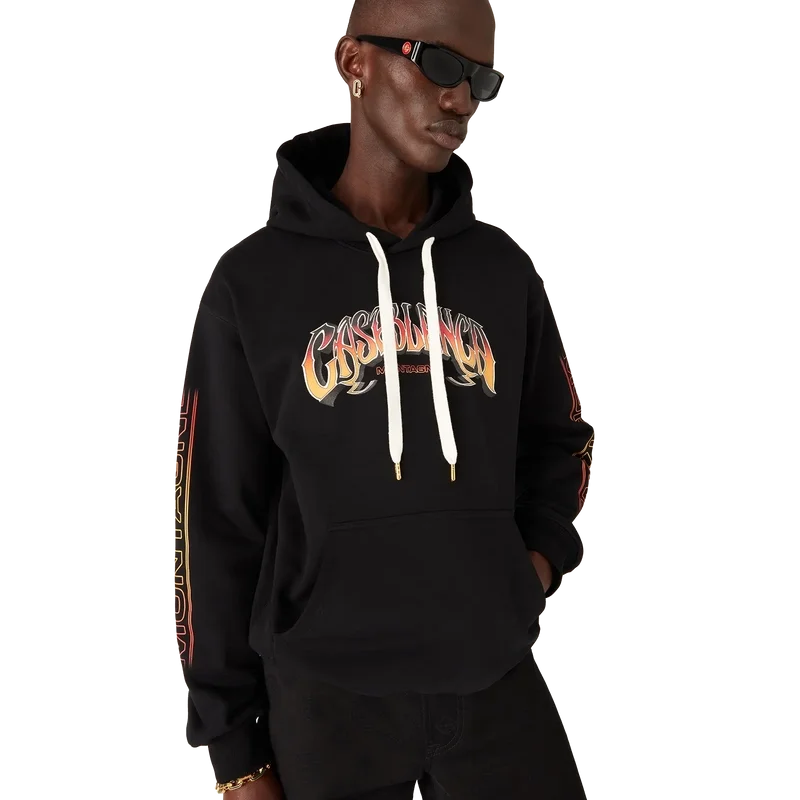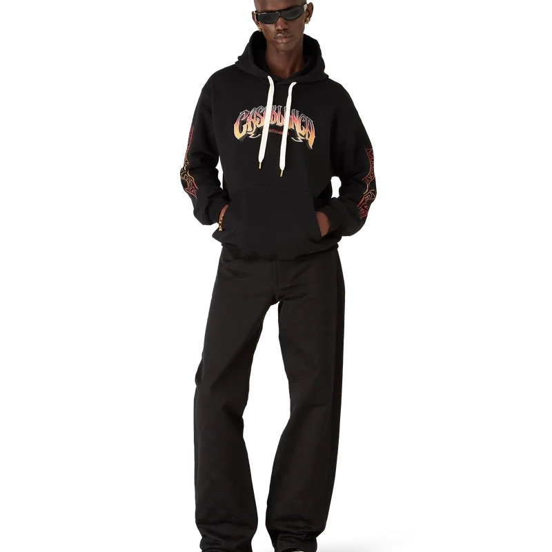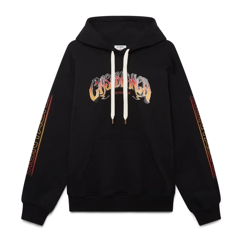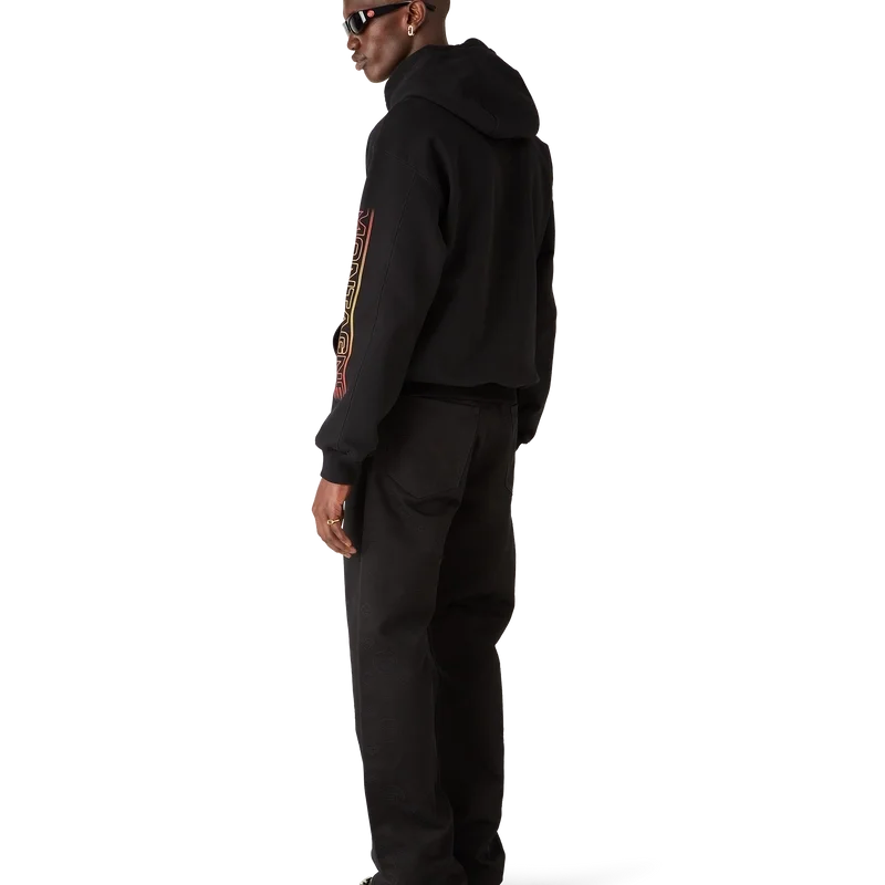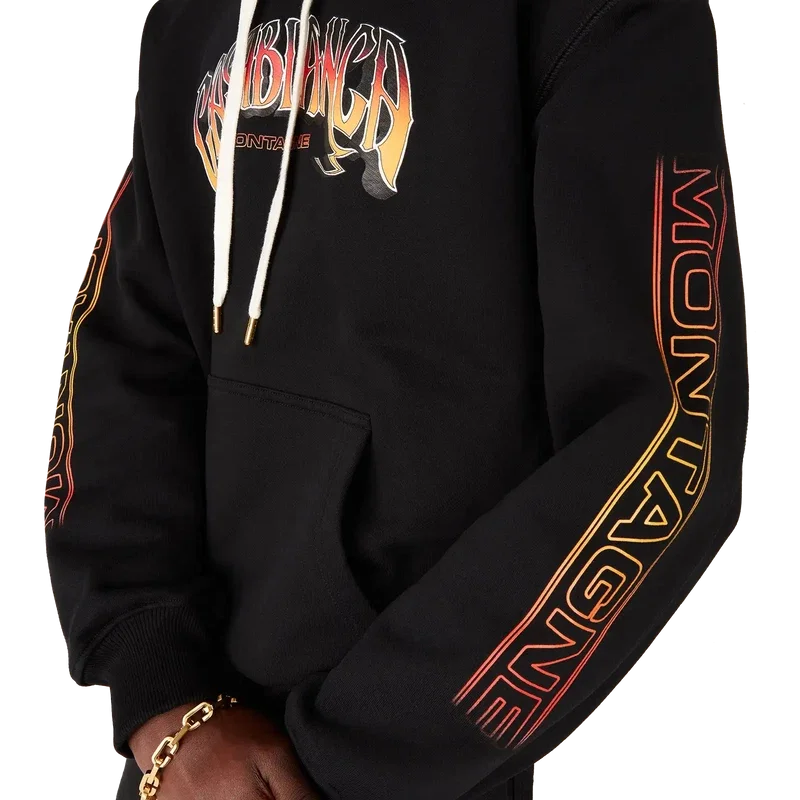 Der Ski-Hoodie ist ein raffiniertes Apras-Sport-Design aus schwarzem Bio-Baumwoll-Loopback-Jersey, inspiriert von der minimalistischen Ästhetik ländlicher Bergrefugien in Japan. Das Design greift die schlichte Schönheit kahler Winterbäume und traditioneller ländlicher Architektur auf und verkörpert Sport- und Freizeit-Elemente. Mit dem Montagne-Print auf den Ärmeln in einem leuchtenden orangefarbenen Farbverlauf.