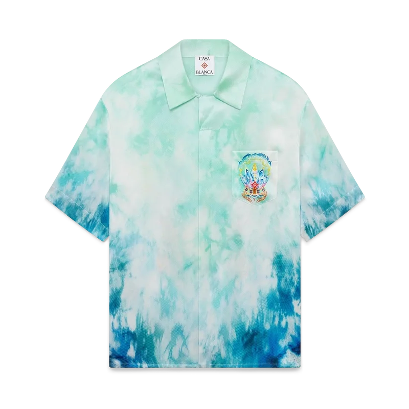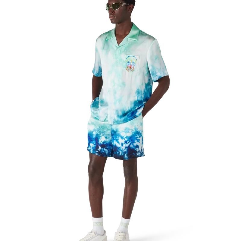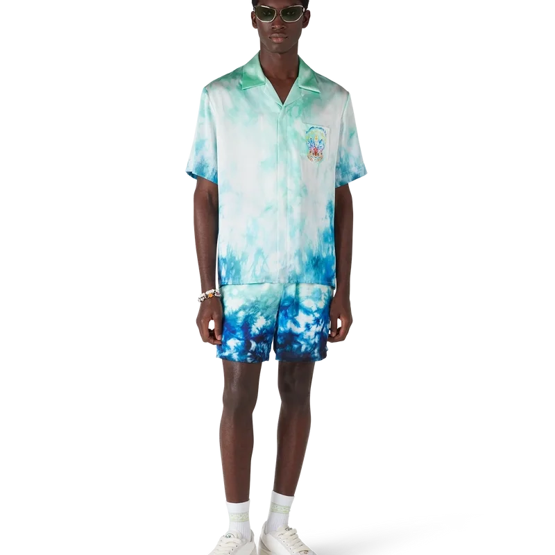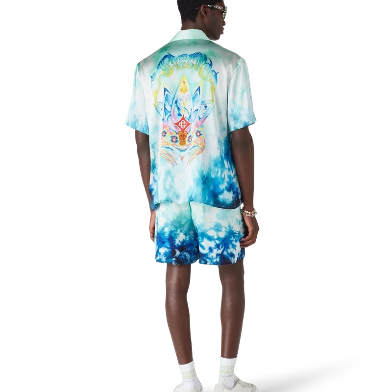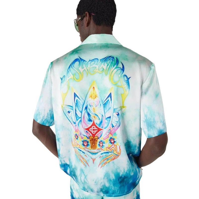 Das Surf Lotus Short-Sleeve-Hemd zeigt fünf Surfbretter, die in Form einer Lotusblüte angeordnet sind, begleitet von einer mit Orchideen verzierten Tiki-Maske, wodurch ein psychedelisches Motiv mit einer lebhaften Farbmischung entsteht. Abgerundet wird das Design durch eine Silhouette mit Kragen, Knopfleiste, Corozo-Knöpfe mit ineinander verschlungenem CC-Logo und eine Brusttasche.