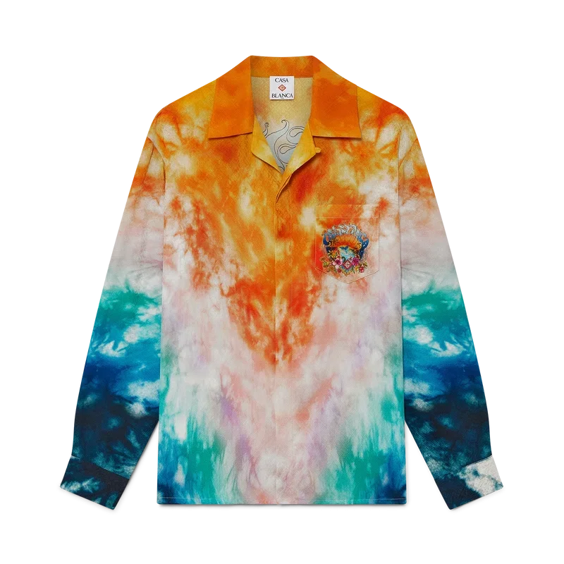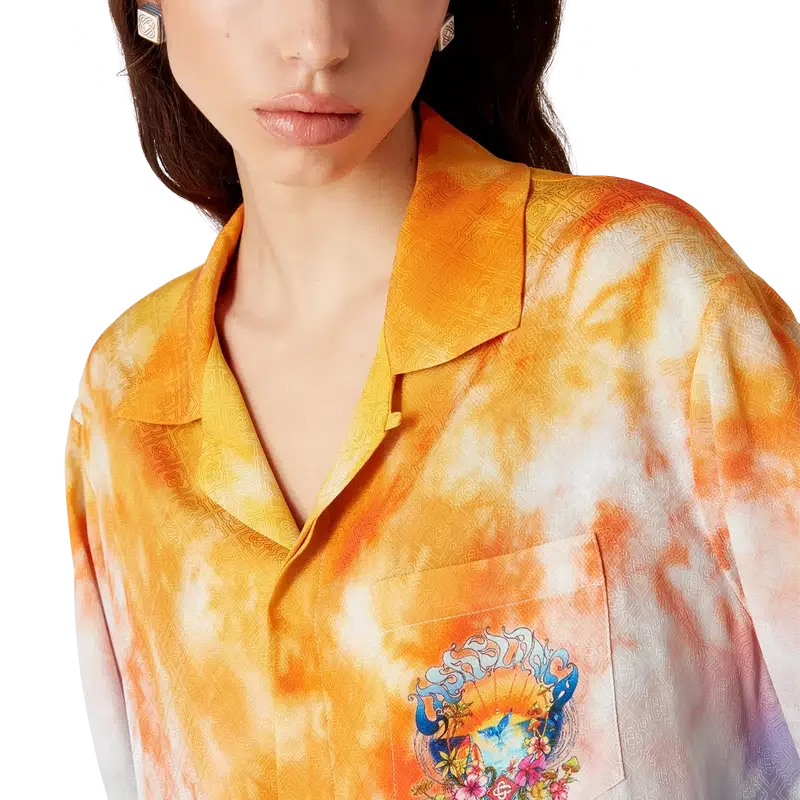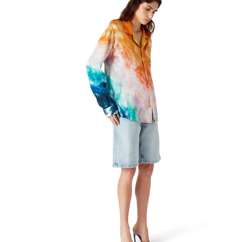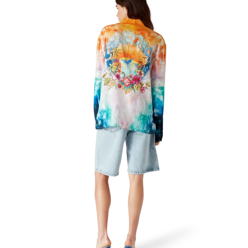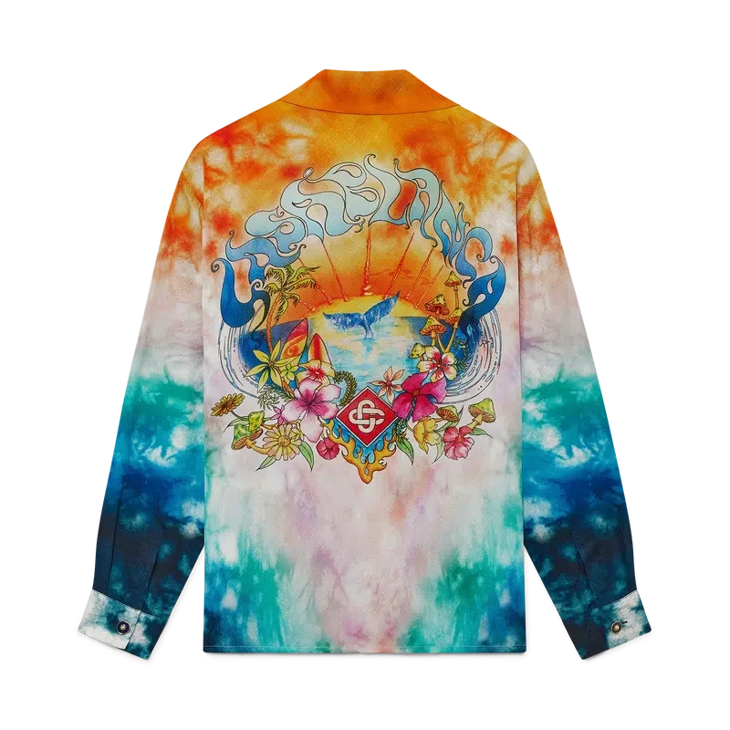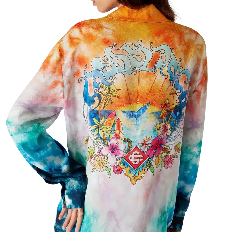 Das Surf Trip Langarm-Seidenhemd ist ein bedrucktes Design aus Seidenstoff mit saisonalen Motiven, inspiriert von der Vintage-Surfkultur Malibus, unter Verwendung von Typografie aus dieser Ära auf einem Tie-Dye-Hintergrund, der auf die Hippie-Kultur verweist. Abgerundet wird es durch einen Kubanerkragen, einen verdeckten Knopfverschluss, Corozo-Knöpfe mit ineinander verschlungenem Cc-Logo und goldrandige Emaille-Knöpfe an den Manschetten.