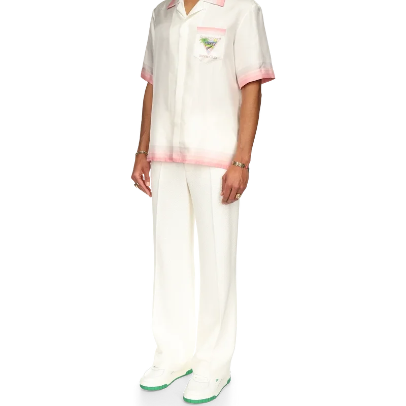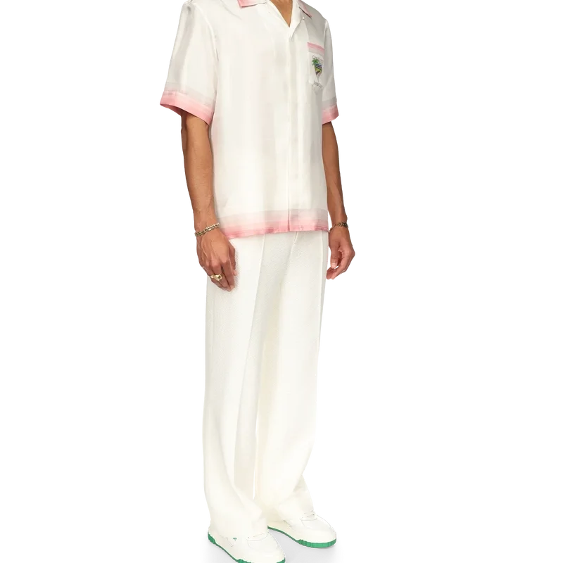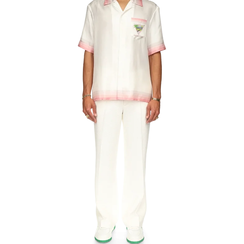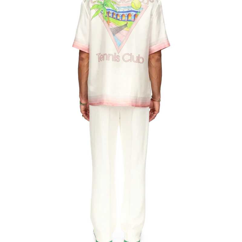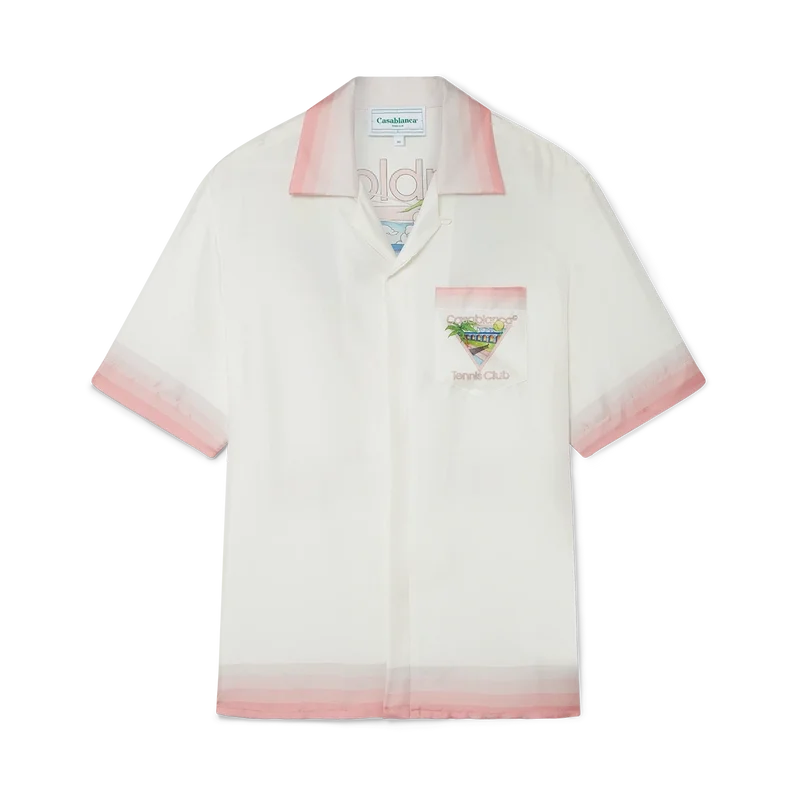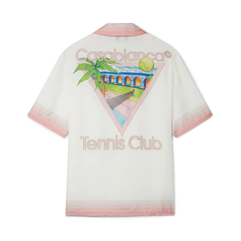 Das Tennis Club Icon Seidenhemd ist ein bedrucktes Kurzarm-Modell mit dem für diese Saison neu interpretierten charakteristischen Design des Hauses, das Elemente aus Tennis, Natur und Architektur vereint. Das aus Seidensatin gefertigte Modell ist mit Farbverlaufsstreifen an Kragen, Manschetten, Saum und Brusttasche, einem Knopfverschluss sowie einem Casablanca-Markenlabel versehen – entworfen für eine lockere Passform.