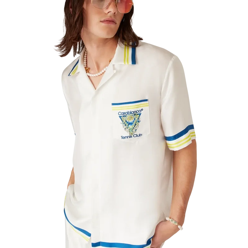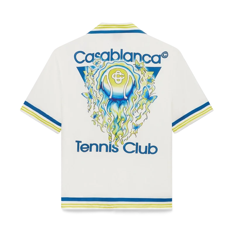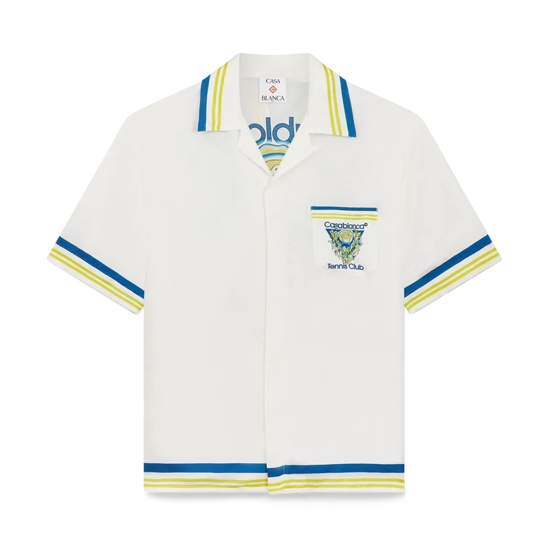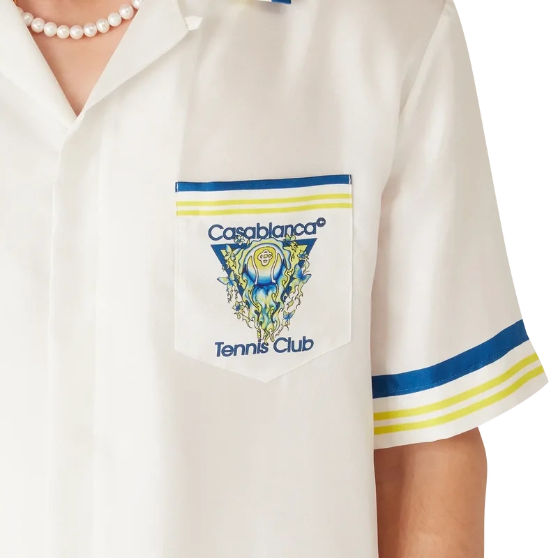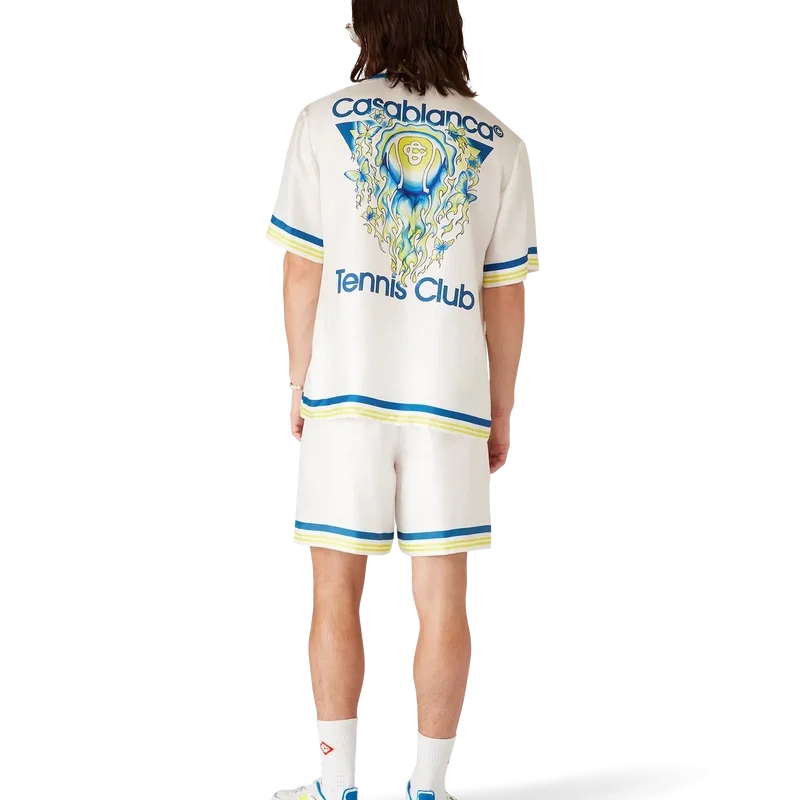 Das Tennis Club Kurzarm-Seidenhemd ist ein bedrucktes Design mit dem charakteristischen Tennisball-Motiv des Hauses im Flug, das die grundlegende Balance aus Kraft, Geschwindigkeit und Kontrolle widerspiegelt.
