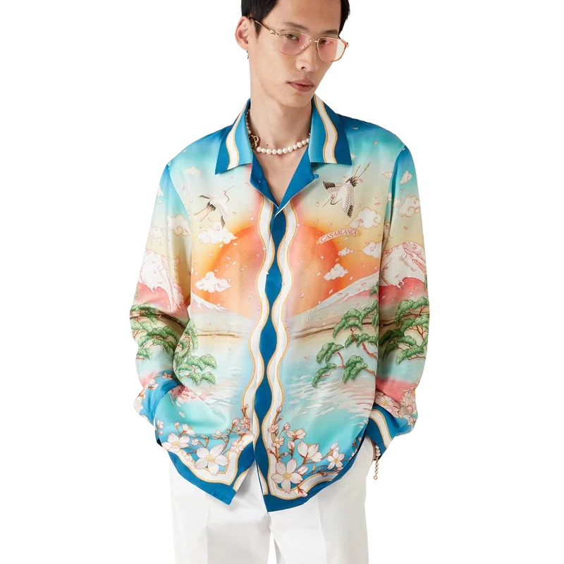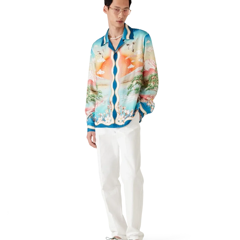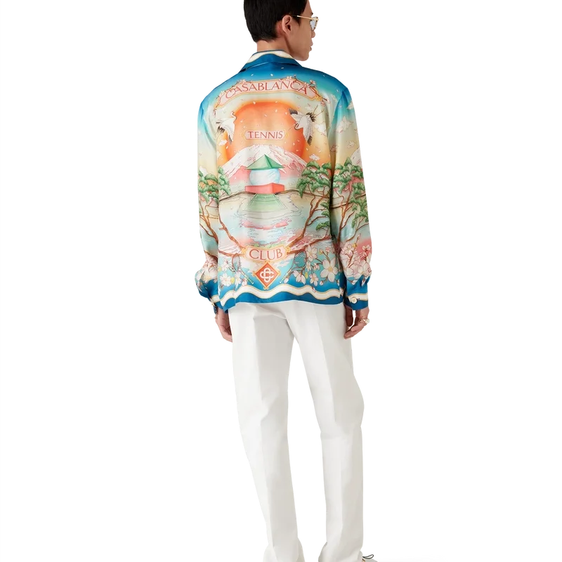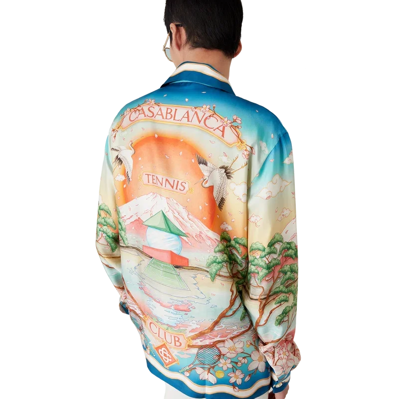 Das Tennis Club Seidenhemd ist ein langärmeliges, durchgehend bedrucktes Design mit der diesjährigen Version des Tennis Clubs, das unser klassisches Layout nutzt, jedoch mit traditioneller japanischer Kunst – was es zu einem Kleidungsstück mit starker Erzählkraft und einer wunderschönen Verschmelzung künstlerischer Stile macht – gefertigt aus Seidentwill. Abgerundet durch einen Knopfverschluss, Corozo-Knöpfe mit ineinander verschlungenem Cc-Logo, charakteristische goldgeränderte Perlmuttknöpfe an Kragen und Manschetten sowie von der Memphis-Welle inspirierte Streifendetails an Saum, Manschetten, Knopfleiste und Kragen.