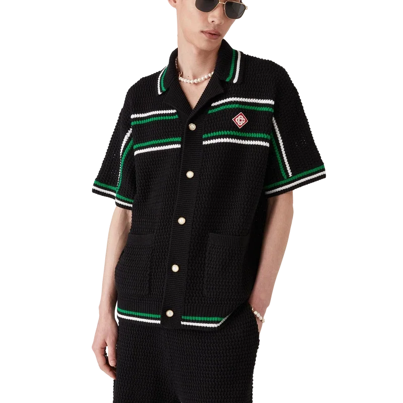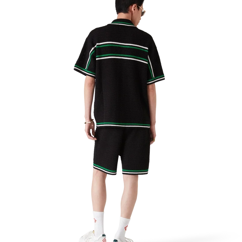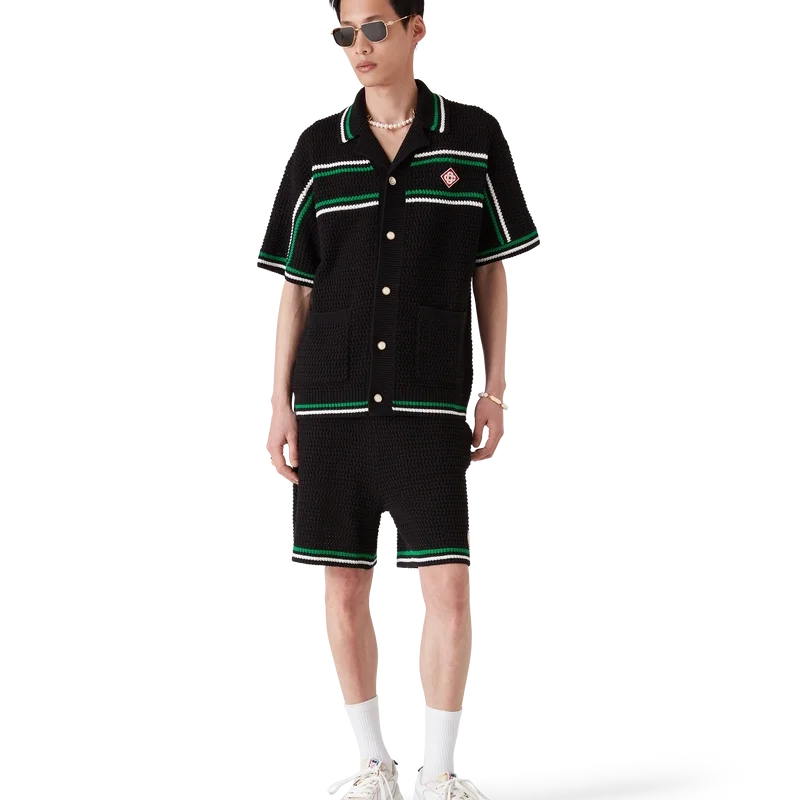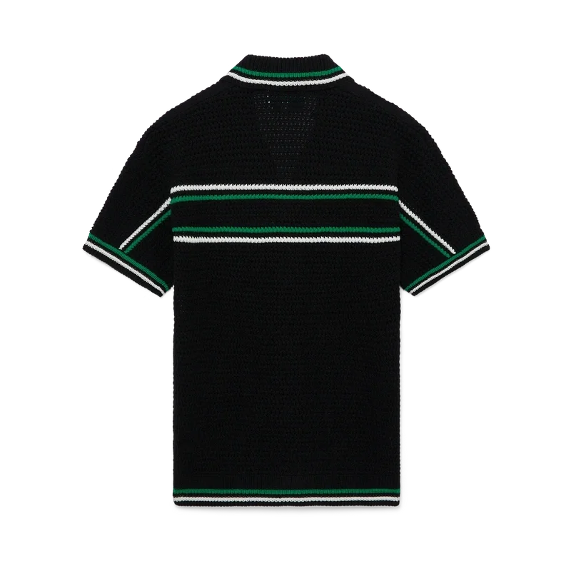 Das Tennis-Häkelhemd ist ein kurzärmeliges, strukturiertes Design aus einem gehäkelten Bio-Baumwollstoff und verfügt über das charakteristische Rautenlogo des Hauses. Abgerundet durch einen gerippten Kragen, Ärmelbündchen, Saum und Knopfleiste, aufgesetzte Taschen vorne, charakteristische goldgeränderte Perlknöpfe, Knopfverschluss vorne sowie grün-weiße Streifenverzierungen auf Brust, Rücken, Ärmeln, Ärmelbündchen, Saum und Kragen.