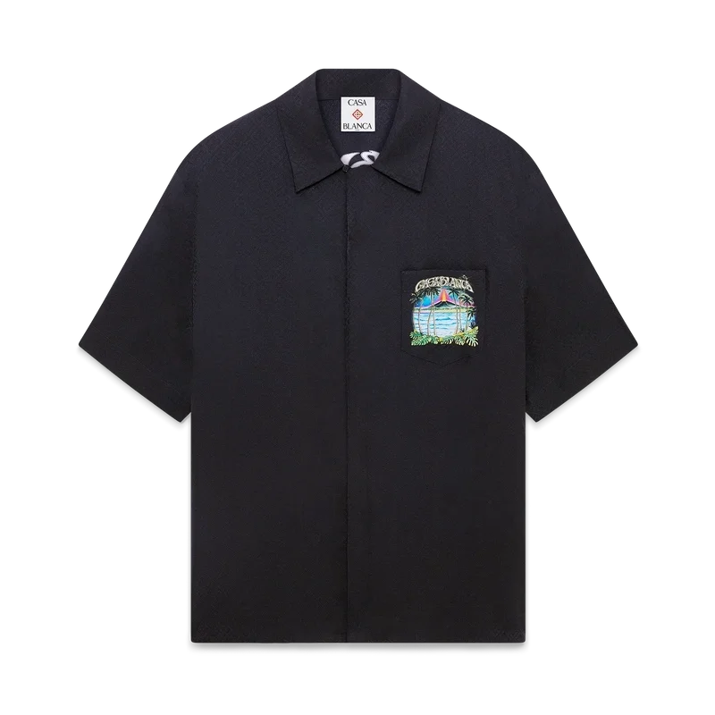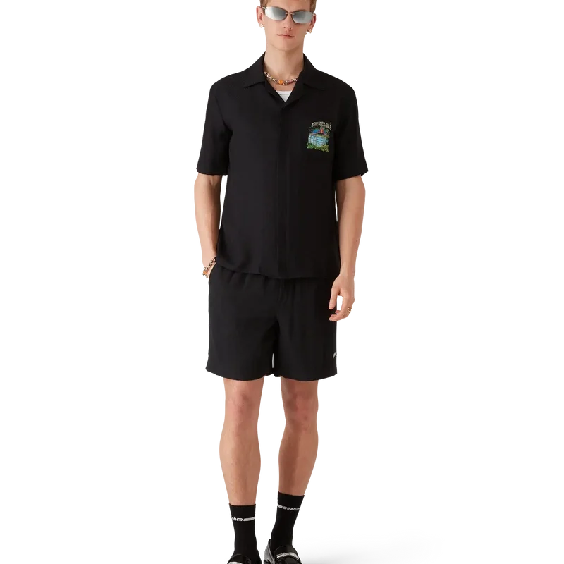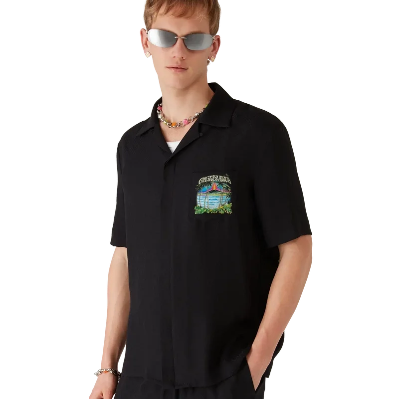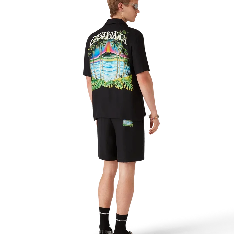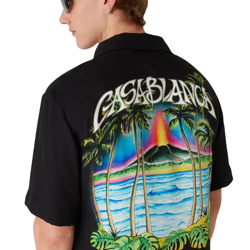 Das Volcano-Kurzarm-Hemd ist ein Seidenmodell mit einem Vulkan, der sich dramatisch hinter halb silhouettierten Palmen abzeichnet, mitten in einem Ausbruch, wobei seine feurige Energie in scharfem Kontrast zu der ruhigen, friedlichen Szene im Vordergrund steht. Abgerundet durch eine Brusttasche, einen Knopfverschluss, Corozo-Knöpfe mit dem Cc-Logo und charakteristische Details, die den raffinierten Ansatz der Marke für luxuriöse Hemden verkörpern.
