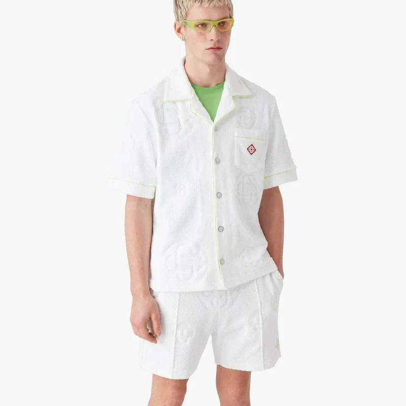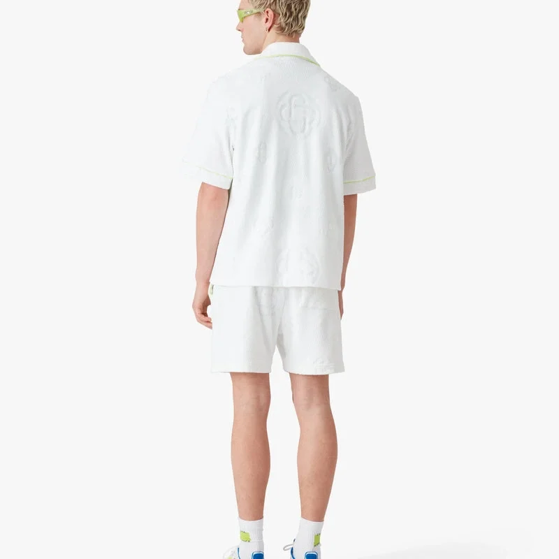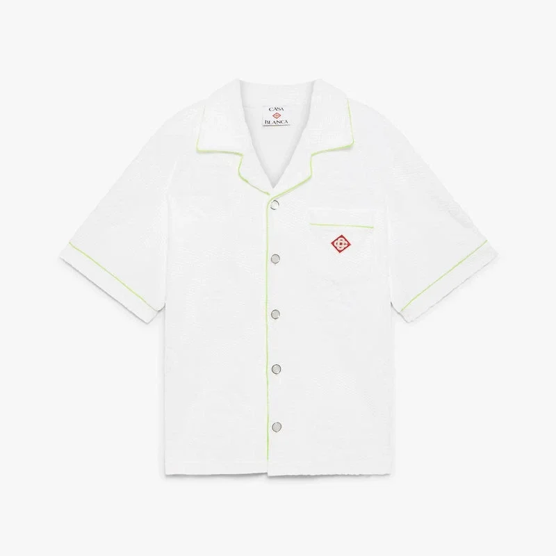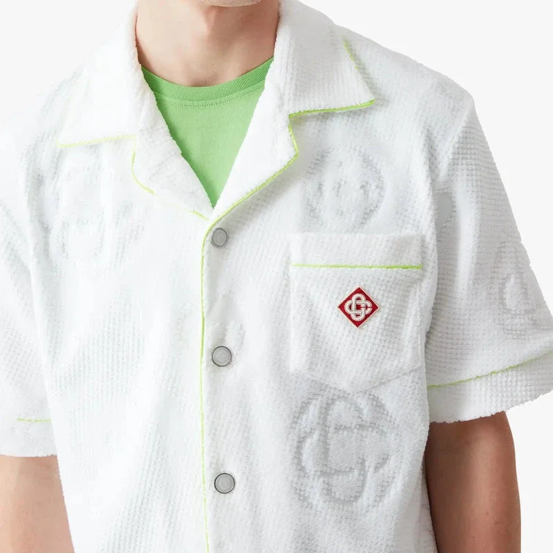 Das Monogram-Frottee-Shirt mit kurzen Ärmeln besticht durch sein raffiniertes Design mit dem ikonischen Monogram-Muster des Hauses sowie dem Casablanca-Diamant-Logo. Abgerundet wird es durch einen kubanischen Kragen, einen Knopfverschluss, die charakteristischen goldgerahmten Perlmuttknöpfe, eine Brusttasche sowie kontrastierende Paspeldetails an der Knopfleiste und der Tasche.