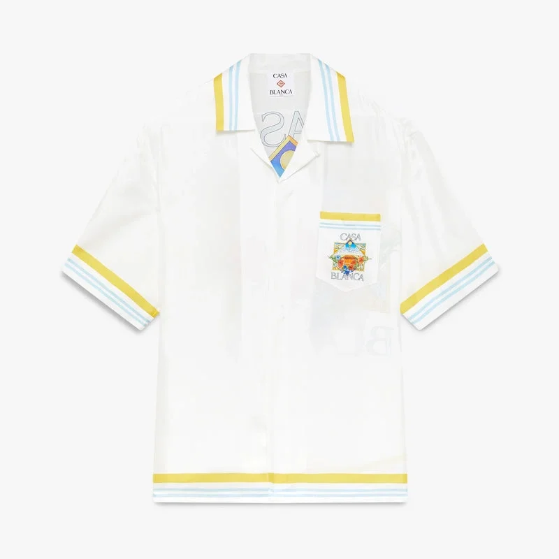 Das kurzärmelige Seidenhemd „Tennis Landscape“ ist ein bedrucktes Design mit einem Motiv, bei dem miteinander verbundene Rahmen Nischen mit verschiedenen Szenen bilden, die durch den Fokus auf den Sport die Transzendenz von Zeit und Ort beschreiben. Abgerundet wird es durch einen Kragen im kubanischen Stil, einen Knopfverschluss, ineinander verschlungene Cc-Logo-Knöpfe aus Corozo, eine Brusttasche sowie Streifenverzierungen an Kragen, Manschetten und Saum.