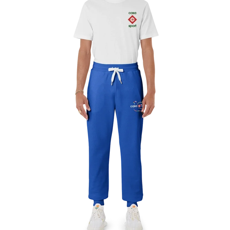 Die blaue Sweathose aus Bio-Baumwolle von Drapeau De Collombes ist mit saisonalen Motiven verziert, die die charakteristische Casa-Sport-Ikonografie des Hauses aufgreifen. Abgerundet durch einen Kordelzug mit goldenen Enden, elastische Bündchen, Seitentaschen und ein Casablanca Paris-Markenlabel, entworfen für eine klassische Passform.