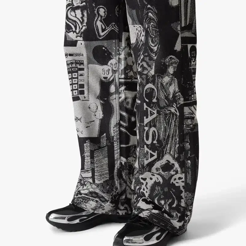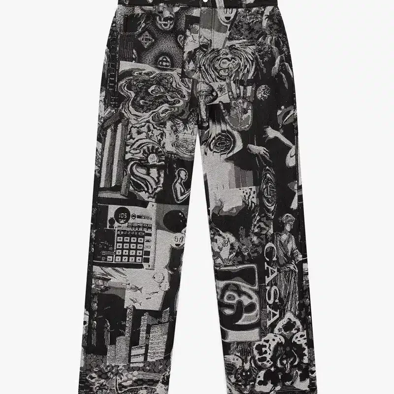 Die Rave Collage Straight Leg Jeans besticht durch ein raffiniertes Design mit saisonalen Motiven, die eine chaotische Sammlung von Rave-Flyern und Symbolen interpretieren, die durch eine Jacquard-Denim-Webart in eine körnige Textur übertragen wurden. Abgerundet durch Gürtelschlaufen, einen Reißverschluss, Vorder- und Gesäßtaschen, ein Futter und versilberte Metallbeschläge.