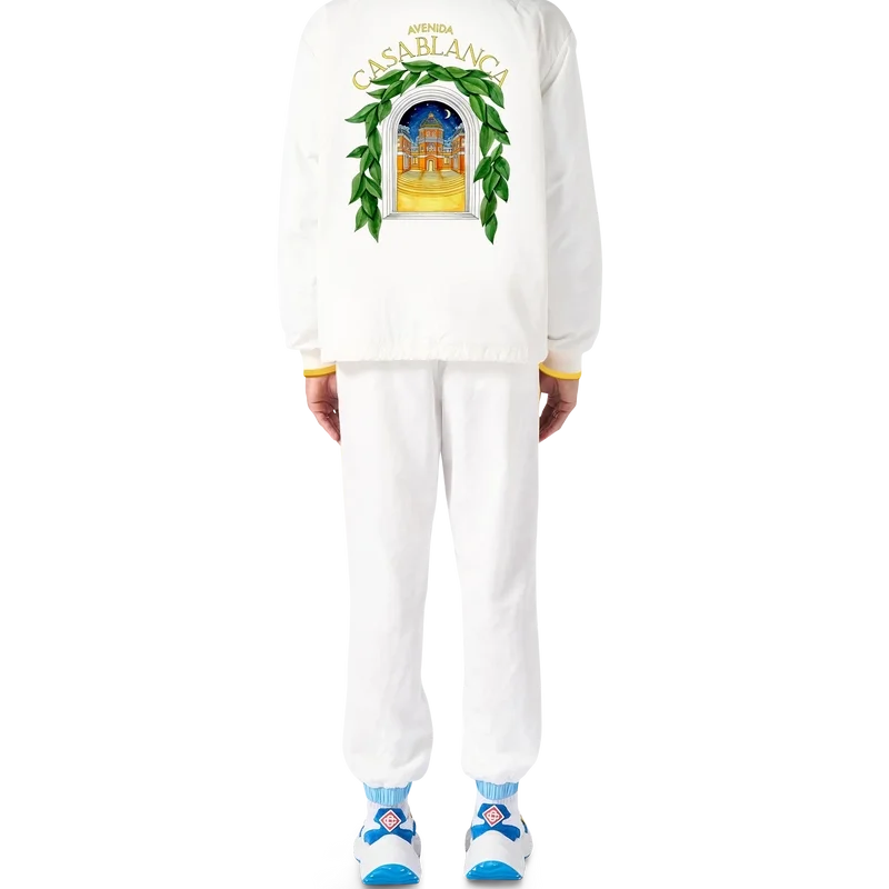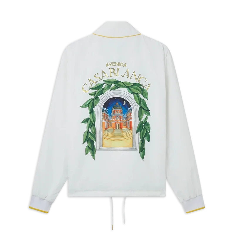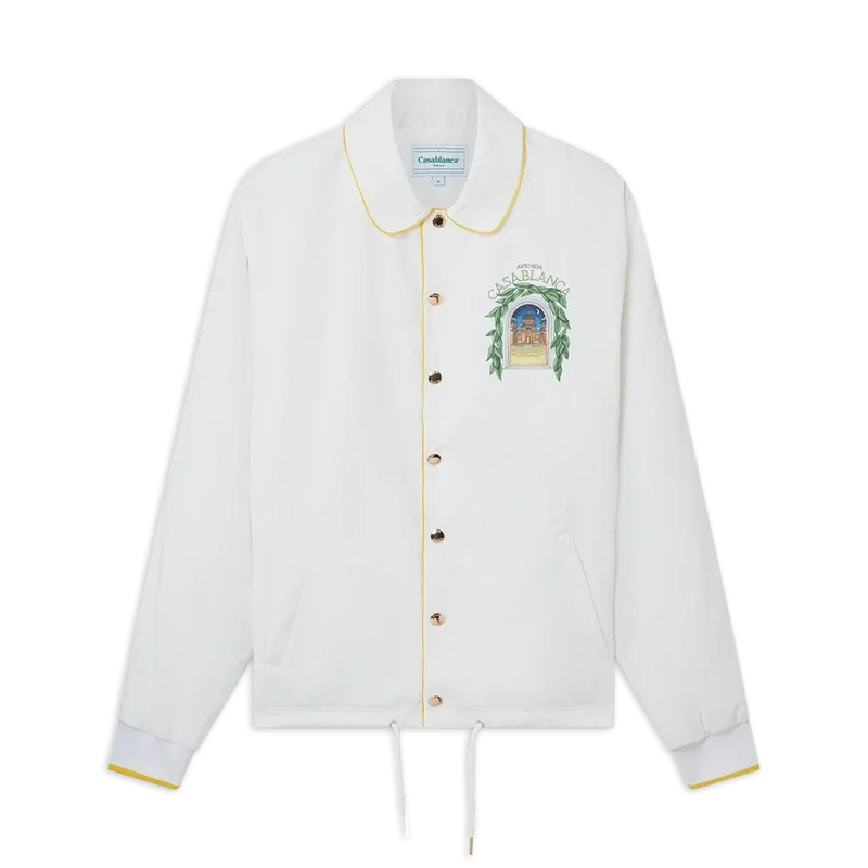 Die Casablanca Avenida Coach Jacke in Weiß besticht durch einen saisonalen Print, bei dem der freie Fluss der Natur auf die Struktur des künstlichen Designs trifft – der Bogen, ein abstraktes Symbol der Stärke. Mit gelbem Rippstrick, Kordelzug und verdeckter Knopfleiste veredelt.