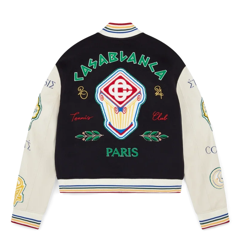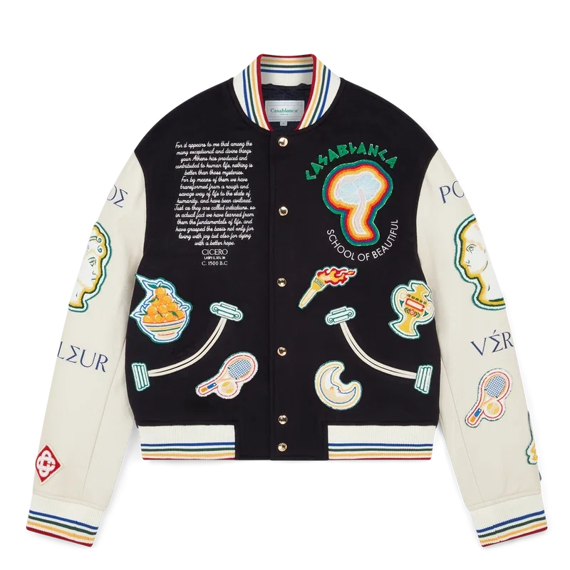 Die Chenille-Patchwork-Bomberjacke ist eine traditionelle Jacke im Bomber-Stil mit Motiven aus früheren Kollektionen. Sie ist aus Schurwolle und Leder gefertigt und mit griechischen Buchstaben bestickt, die antike griechische Einflüsse mit futuristischen Elementen verbinden, ergänzt durch die charakteristischen Designelemente des Hauses wie Lorbeerblätter, einen Tennisschläger und -ball, Orangen sowie eine Fackel. Abgerundet durch saisonale Motive aus dem antiken Griechenland, Taschenöffnungen in Form einer geschwungenen ionischen Säule, einen Knopfverschluss mit vergoldeten Markenbeschlägen, einen gerippten Stehkragen sowie Ärmelbündchen und Saum mit mehrfarbigen Streifendetails.