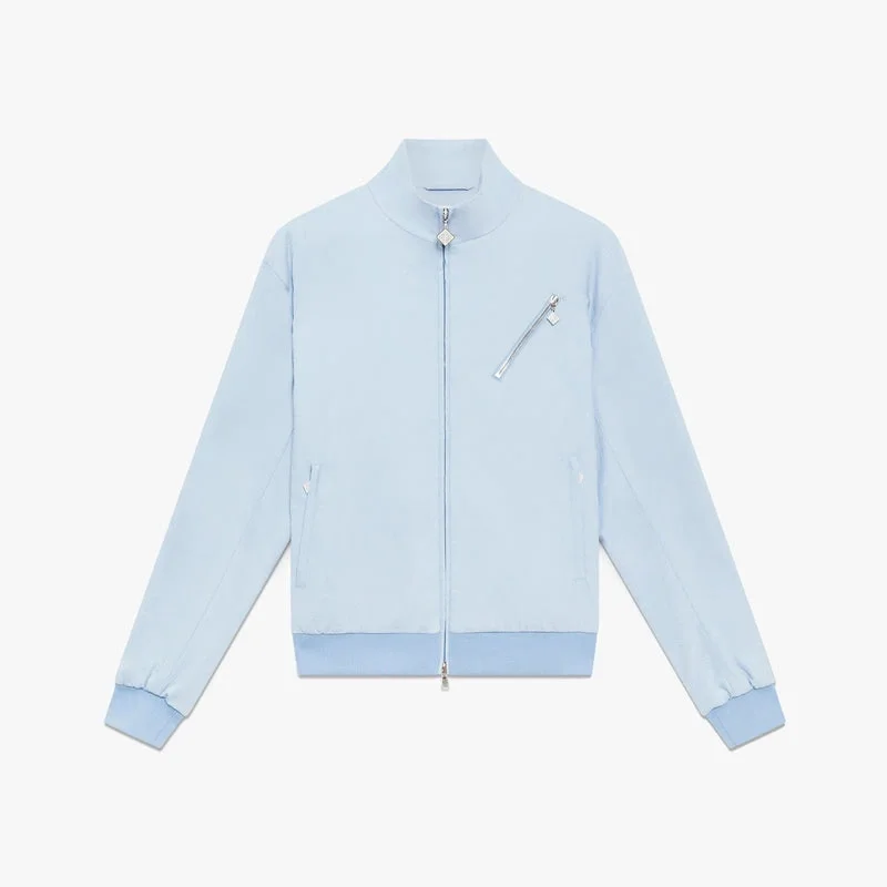 Die hellblaue Jacquard-Jacke mit Reißverschluss besticht durch ein raffiniertes Design mit dem ikonischen Monogramm-Muster des Hauses und verkörpert dessen gehobenen Ansatz bei Freizeitbekleidung. Ausgestattet mit Kragen, Reißverschluss, elastischen Bündchen und Saumdetails, einem Futter sowie Paspeltaschen mit Reißverschluss.