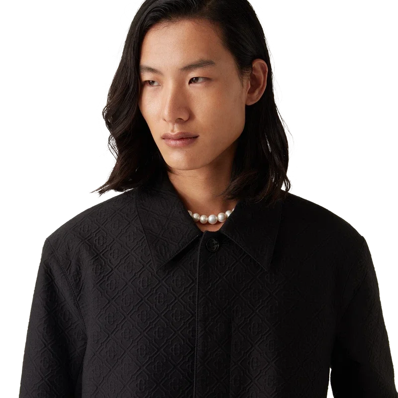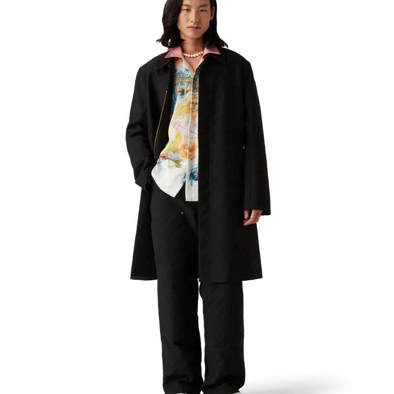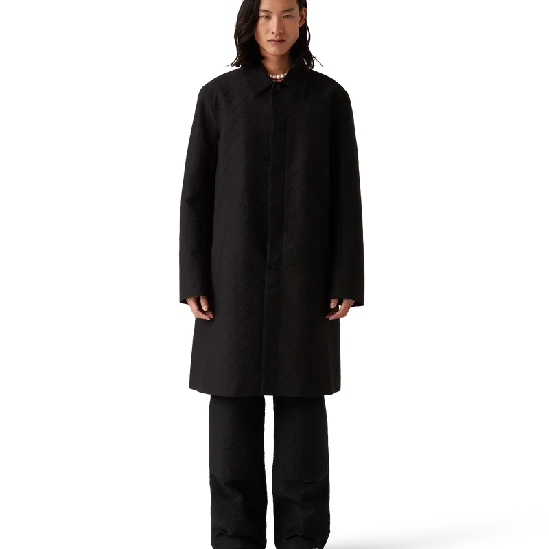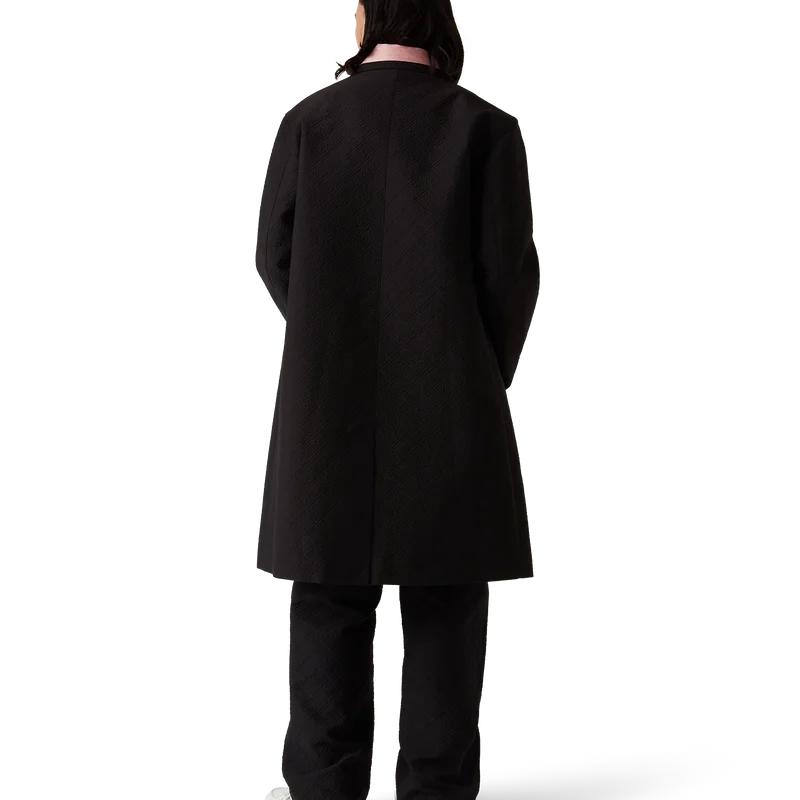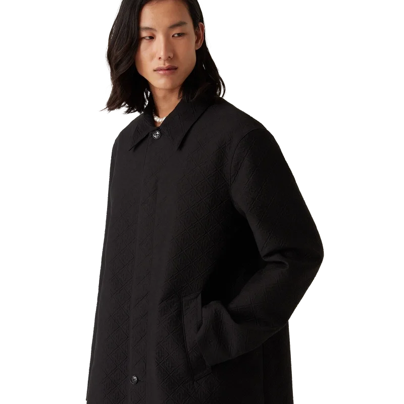 Der Jacquard-Car-Coat ist ein mittellanger Mantel aus einem Jacquard-Baumwollmischgewebe mit dem charakteristischen Diamond Monogram des Hauses. Er verfügt über einen Knopfverschluss vorne, vergoldete Druckknöpfe mit Markenlogo, ein Futter, einen Trichterkragen, vertikale Seitentaschen und einen Schlitz hinten.