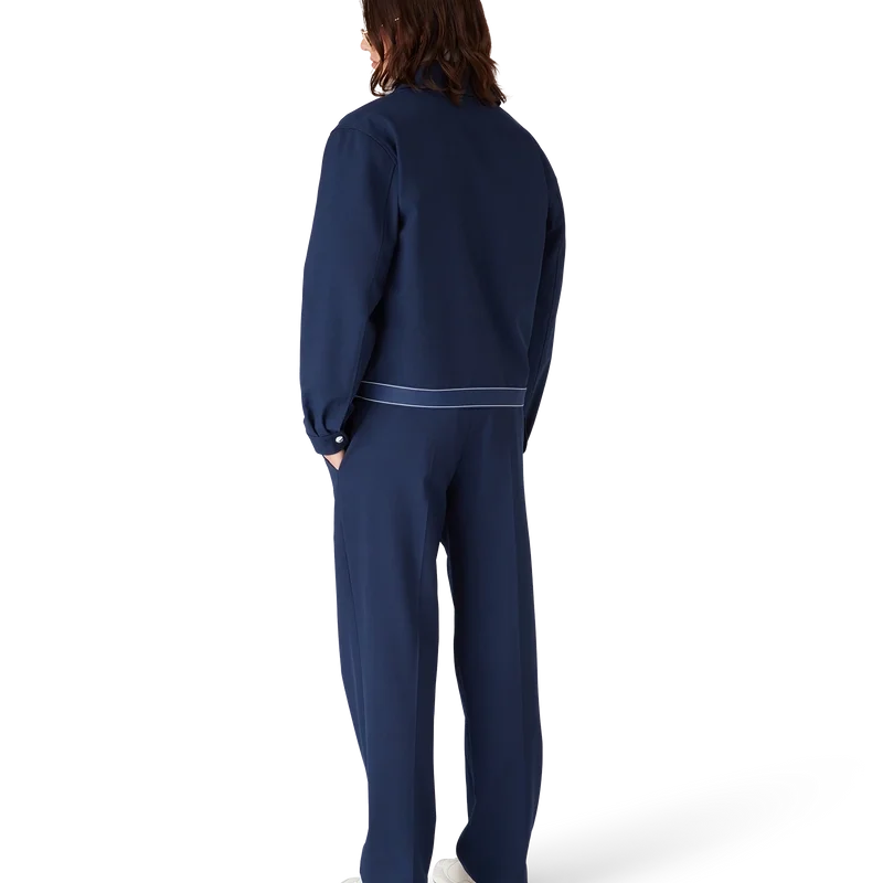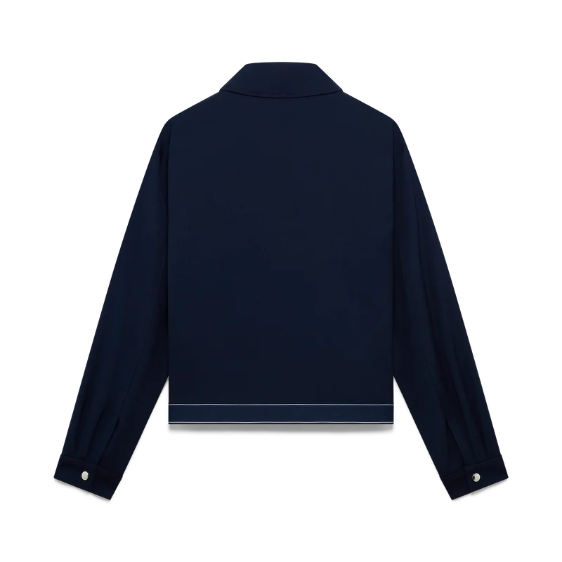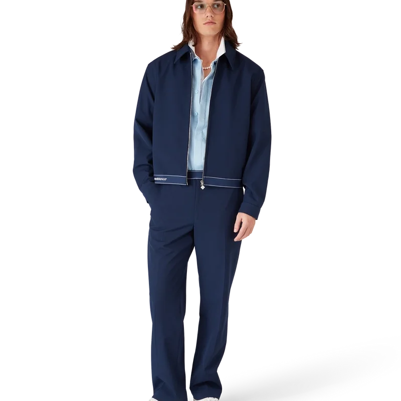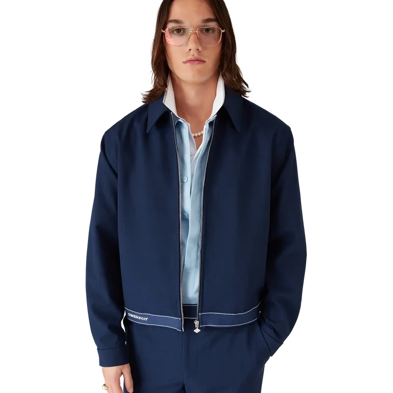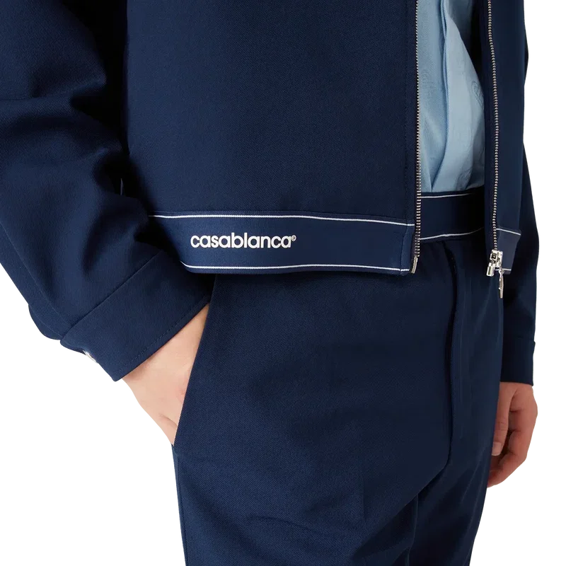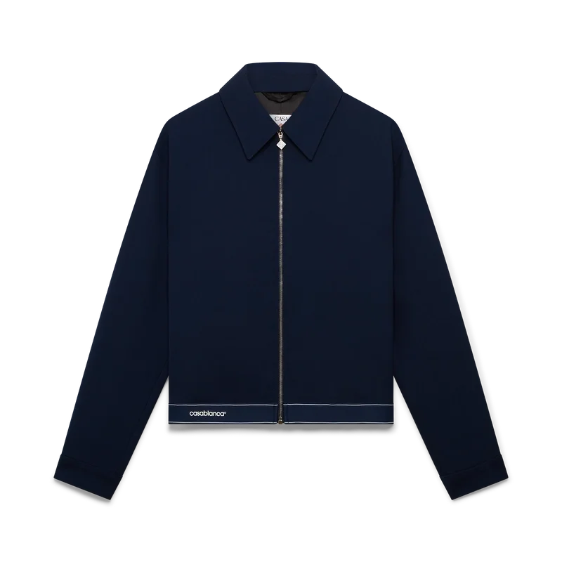 Die marineblaue Sportjacke aus Wolle ist ein raffiniertes Design aus einem Wollmischgewebe, das die Sport- und Freizeit-Sensibilität des Hauses widerspiegelt. Abgerundet durch einen Spitzkragen, einen Frontreißverschluss mit charakteristischer Reißverschlusslasche mit Diamantlogo, ein Futter, vergoldete Markenbeschläge und ein Saumdetail mit dem Casablanca-Logo des Hauses sowie Streifenkanten.