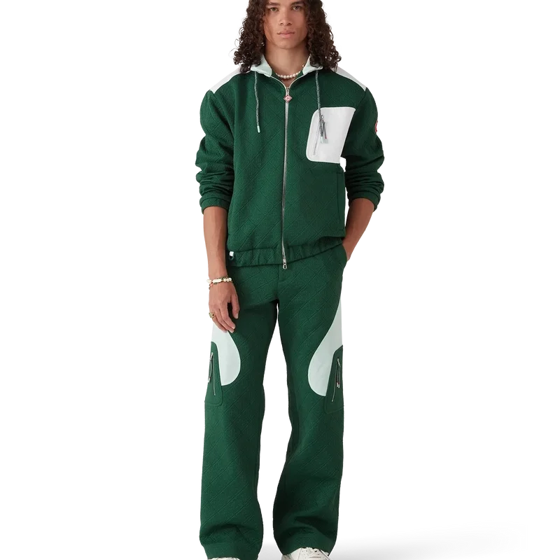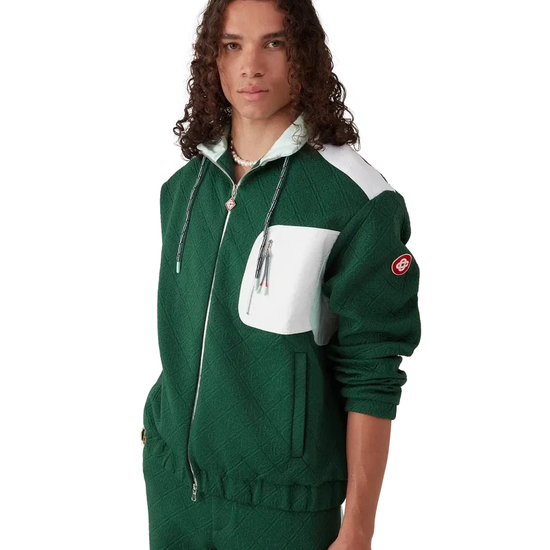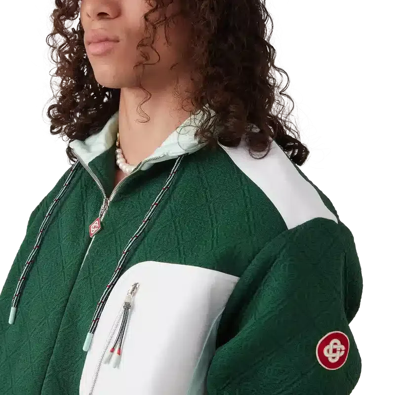 Die Nylon-Monogram-Jacquard-Jacke ist ein langärmeliges Modell aus Jacquard-Strickstoff. Sie verfügt über einen hohen Kragen mit Kordelzug, einen Reißverschluss, vertikale Paspeltaschen und eine kontrastfarbene Brusttasche mit Reißverschluss, elastische Bündchen und Saum, Ellbogenpatches, das CC-Logo-Patch des Hauses auf dem Ärmel, einen Unterarm-Einsatz mit Belüftungsloch sowie ein Mesh-Futter.