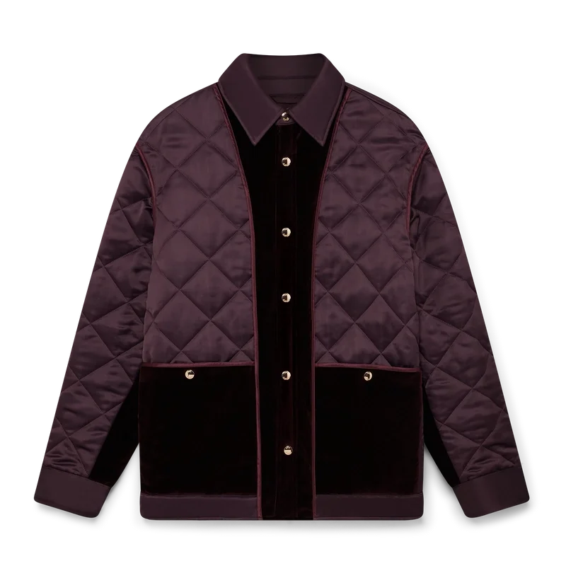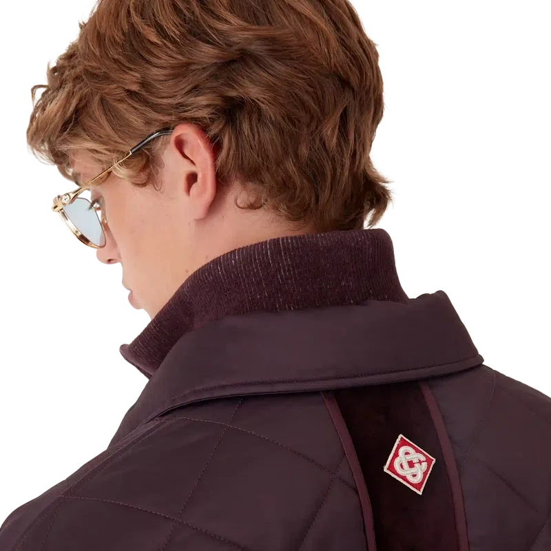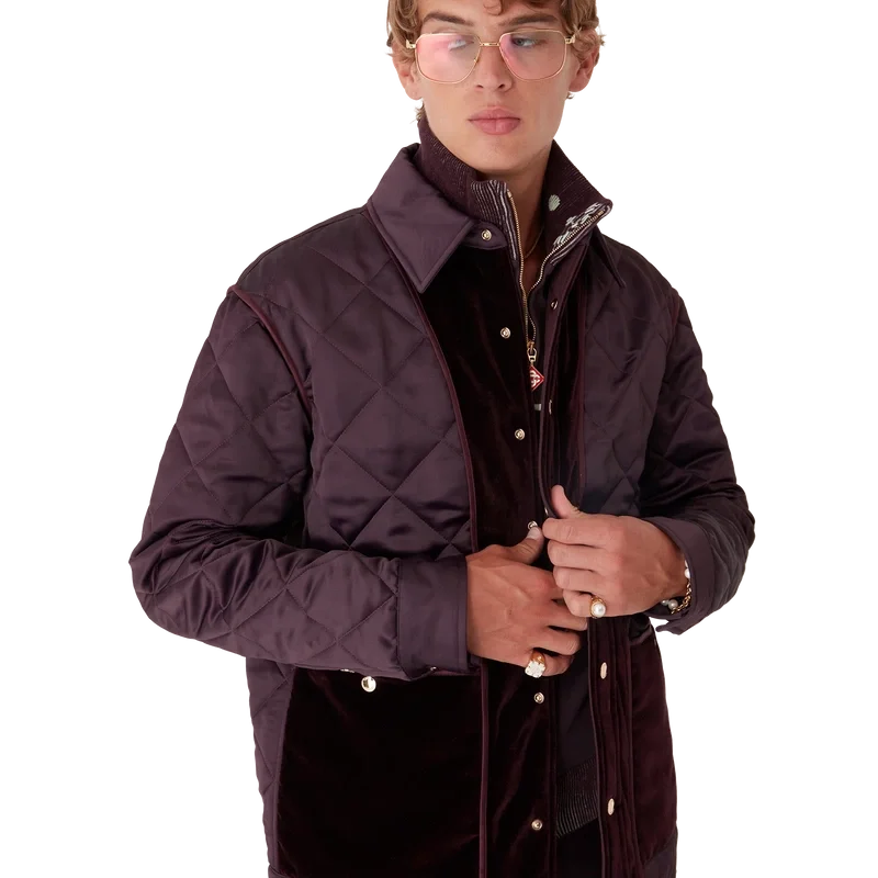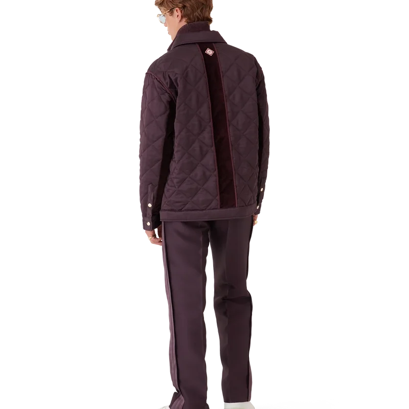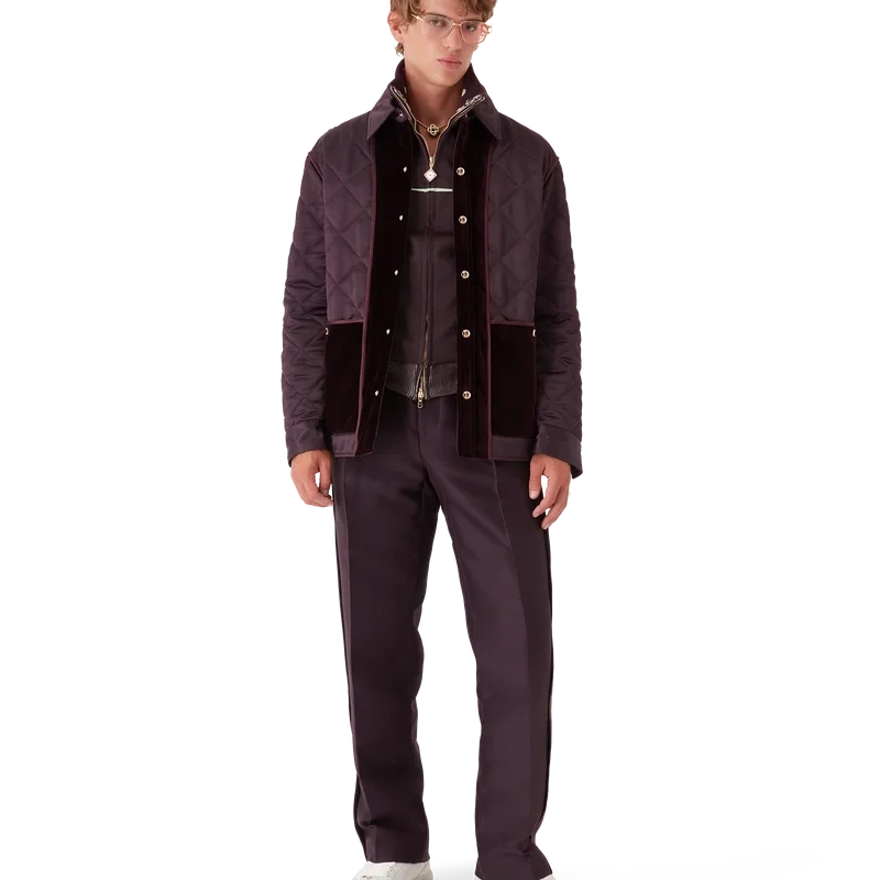 Die gesteppte Satinjacke ist ein langärmeliges Modell der Oberbekleidung aus Satin mit Kontrastelementen aus Baumwollsamt. Sie verfügt über einen Spitzkragen, einen Knopfverschluss, vergoldete Druckknöpfe mit Casablanca-Logo, Ärmelbündchen aus Baumwollsamt, aufgesetzte Taschen mit Druckknopfverschluss und ein Rückenteil in der Mitte mit dem charakteristischen Rautenlogo des Hauses.