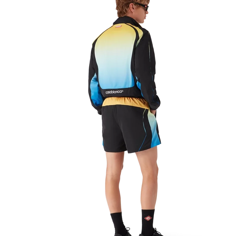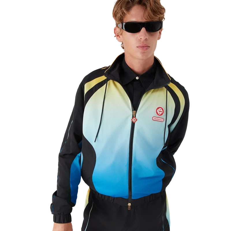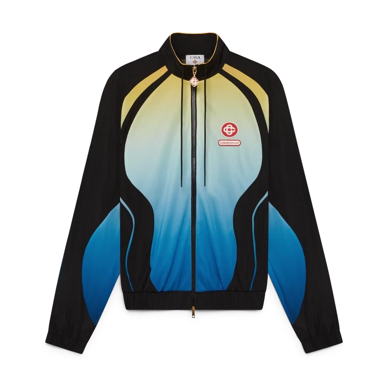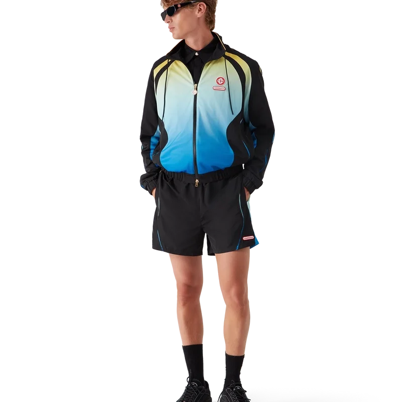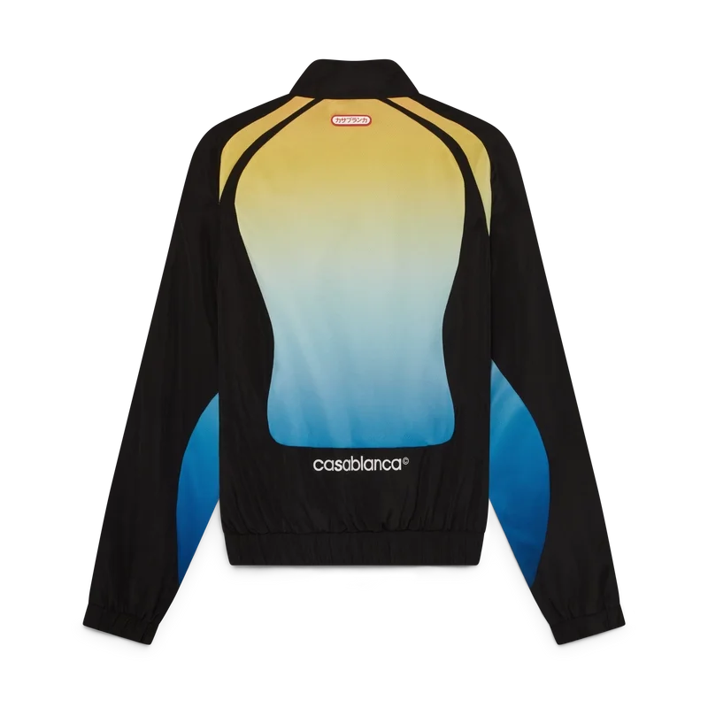 Die Gradient Windbreaker Jacke ist ein langärmeliges Sportbekleidungsdesign mit dem charakteristischen ineinander verschlungenen Cc-Logo des Hauses und dem Casablanca-Logo-Patch, ganz in unserer Tradition, die kraftvollen natürlichen Farbpaletten der Natur neu zu interpretieren – Unser saisonaler Farbverlauf ist von den lebhaften und auffälligen natürlichen Farbtönen der Pfeilgiftfrösche inspiriert; die kräftigen Blau- und Gelbtöne dienen in der Natur als Warnsignal und werden mit derselben aufmerksamkeitsstarken Absicht in unseren Drucken und Sportbekleidungsmodellen eingesetzt, kontrastiert durch tiefschwarze Einsätze in organischen, fließenden Formen, die die charakteristischen Muster dieser Tiere nachahmen. Abgerundet durch einen hohen Kragen mit gelben Paspeldetails, Kordelzug, Reißverschluss mit dem charakteristischen Diamond-Logo-Reißverschlusszug, elastische Bündchen und Saum sowie schwarze Einsätze.