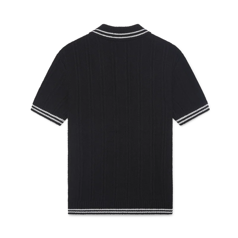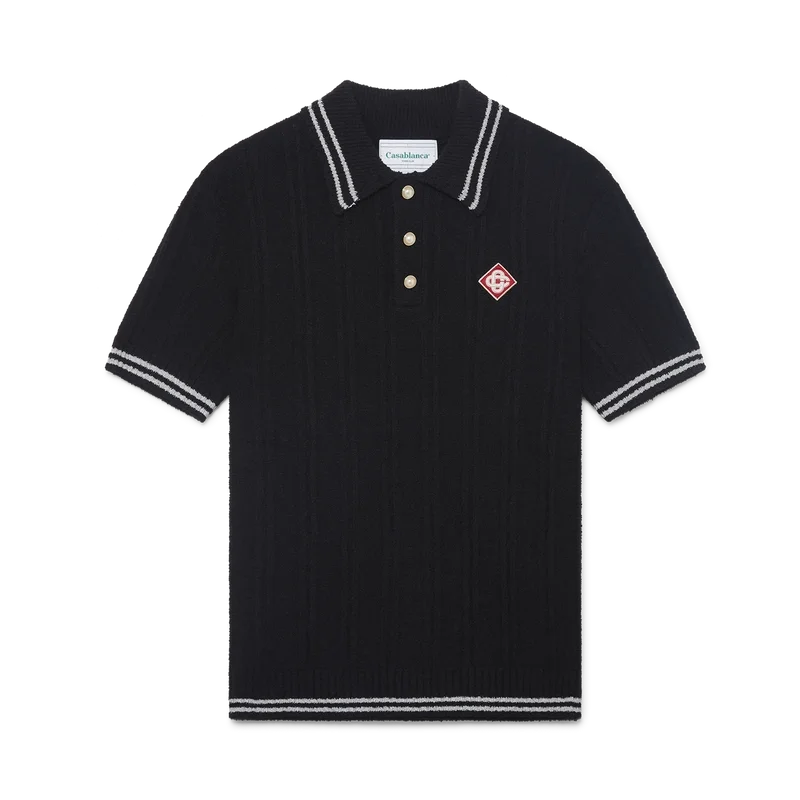 Das Bouclé-Poloshirt mit silbernem Besatz ist ein kurzärmeliges Modell aus einem Baumwollmischgewebe mit dem charakteristischen Rautenlogo des Hauses. Abgerundet wird es durch die charakteristischen goldgeränderten Perlknöpfe des Hauses, Kantenverzierungen an Kragen und Saum sowie einen gerippten Kragen, Ärmelbündchen, Knopfleiste und Saum.