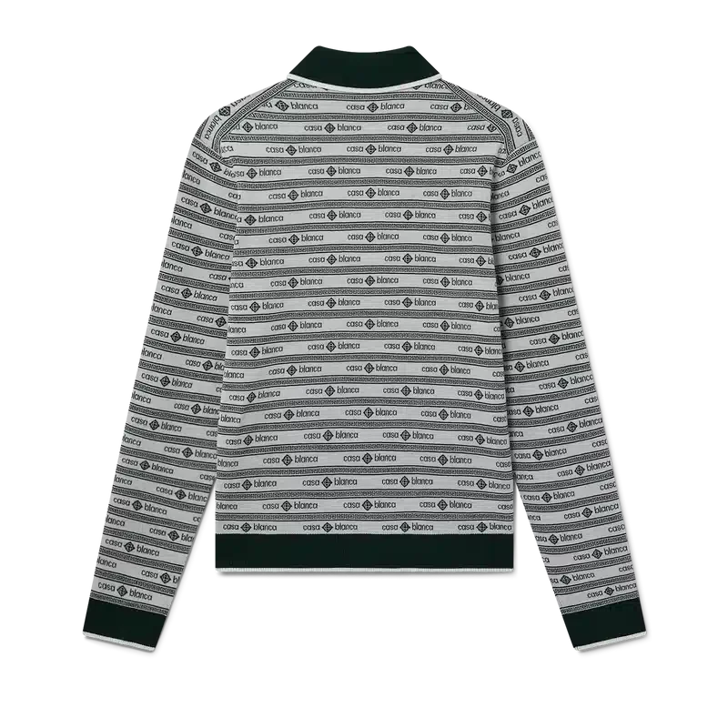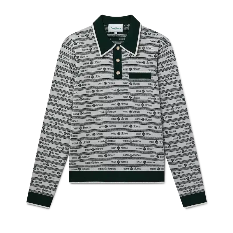 Das Evergreen Logo Poloshirt ist ein Langarm-Modell mit dem Casablanca-Logo des Hauses, gefertigt aus Merinowolle. Abgerundet durch charakteristische Perlenknöpfe mit Goldrand, eine Brusttasche und kontrastierende Rippdetails mit weißen Kanten an Kragen, Manschetten, Saum, Knopfleiste und Tasche.