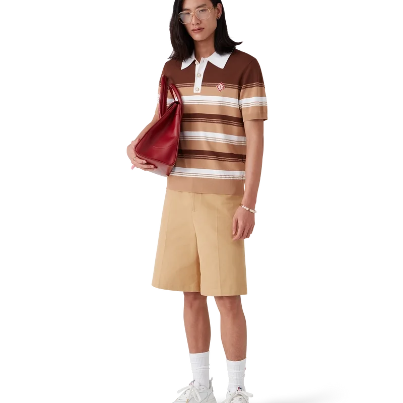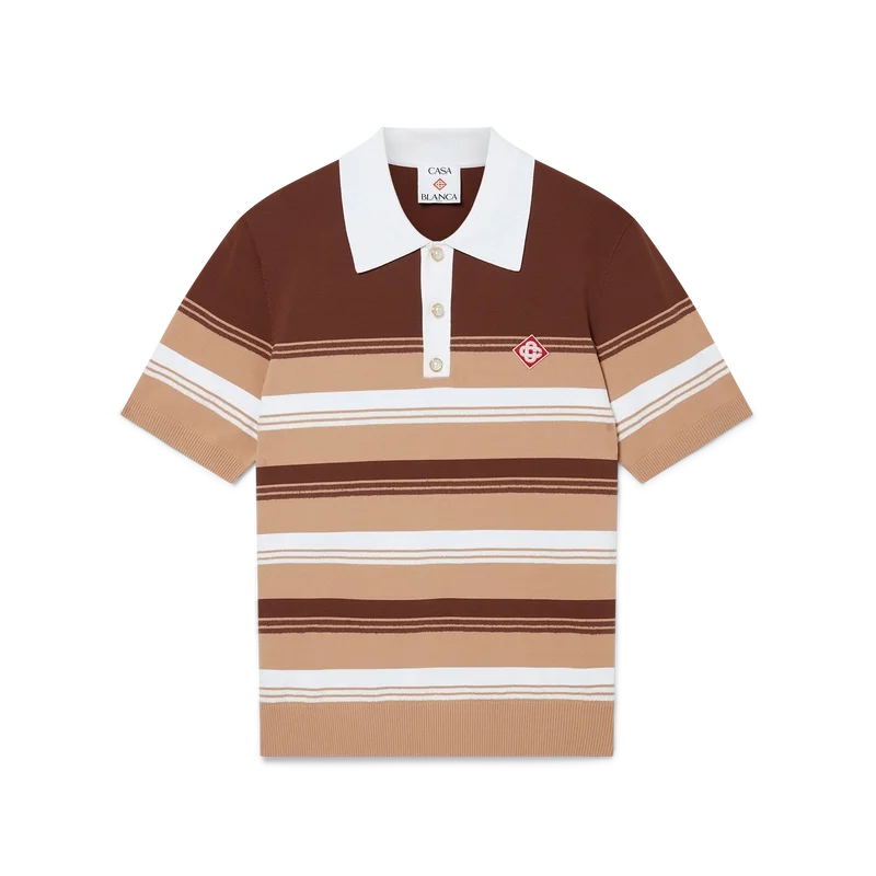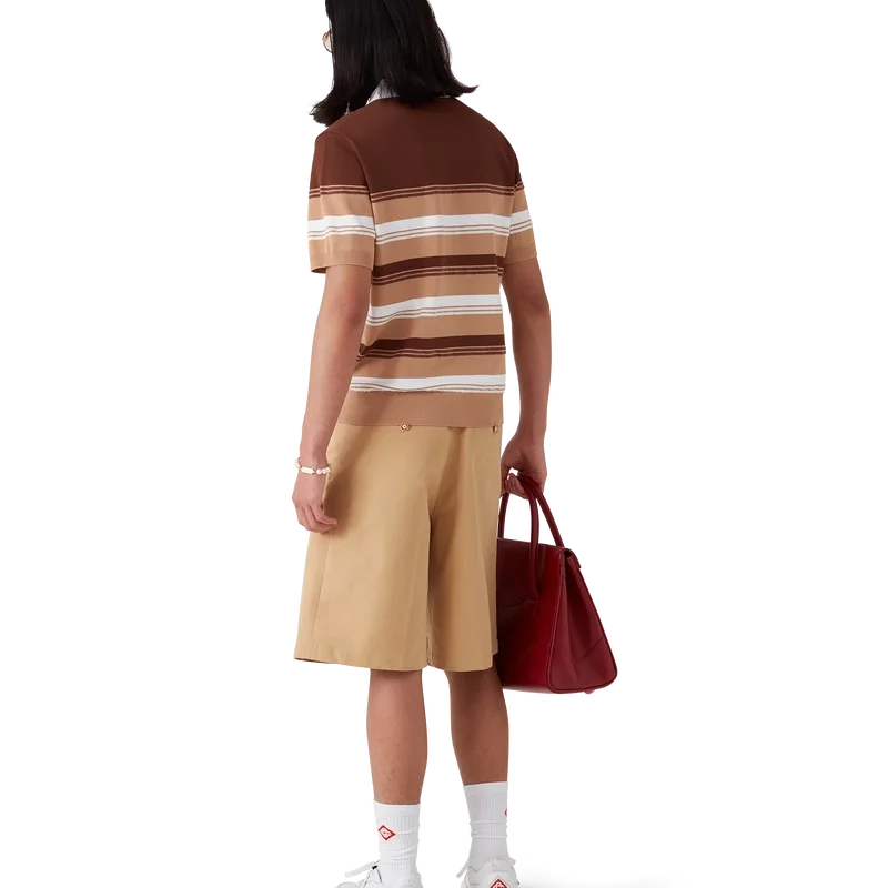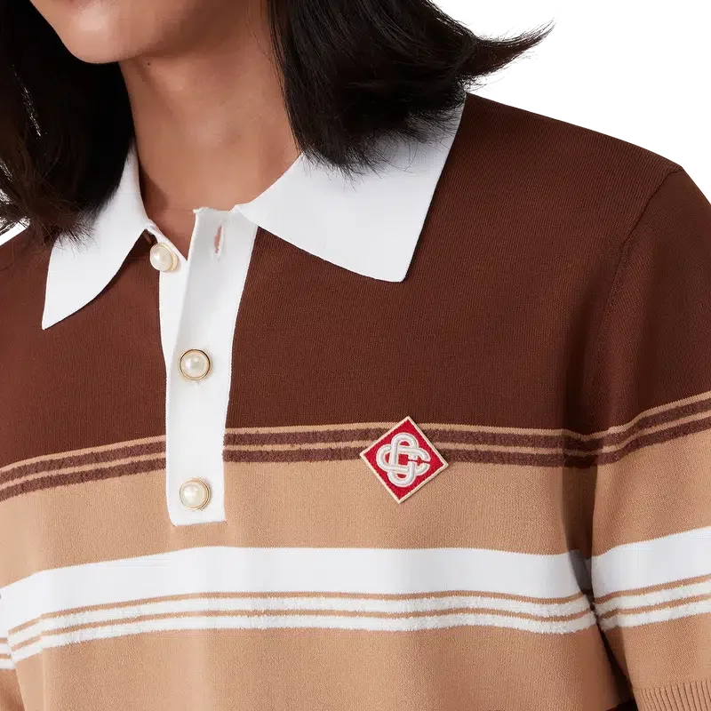 Das gestreifte Poloshirt ist ein kurzärmeliges Modell aus gestreiftem Strickstoff mit dem charakteristischen Rautenlogo des Hauses. Abgerundet durch charakteristische goldgeränderte Perlknöpfe, eine Knopfleiste mit drei Knöpfen sowie gerippte Bündchen, Saum, Kragen und Knopfleiste.