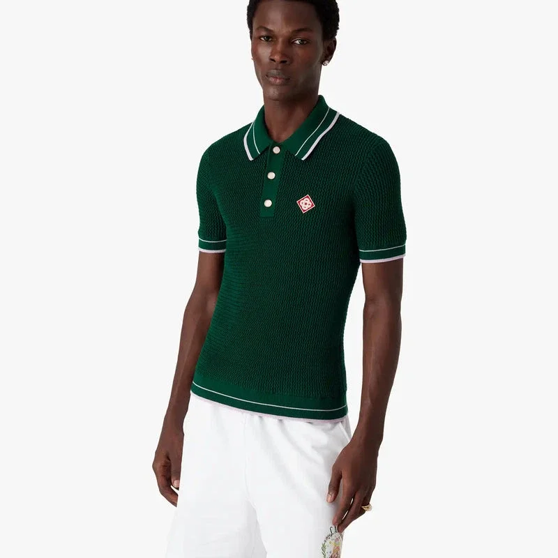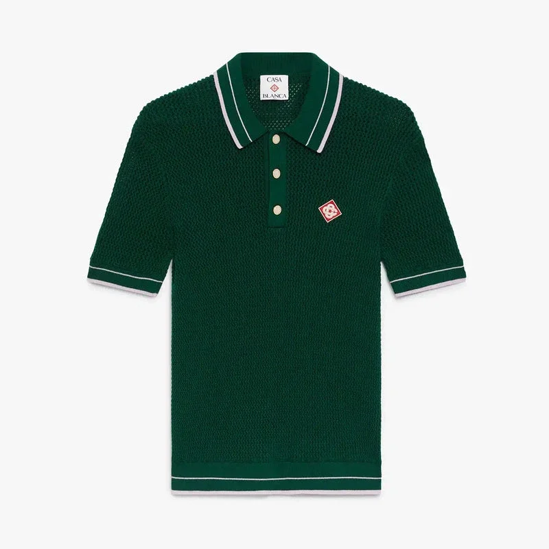 Das grüne, kurzärmelige Polo-Shirt aus Häkelstoff besticht durch ein raffiniertes Design und eine offene Webstruktur. Es verfügt über einen gerippten Spitzkragen, gerippte Ärmelbündchen und einen gerippten Saum mit gestreiften Kanten, einen Knopfverschluss, charakteristische goldgerahmte Perlenknöpfe sowie das „Casablanca“-Logo des Hauses.
