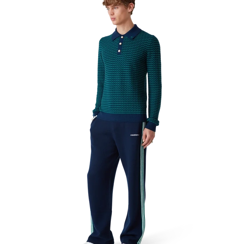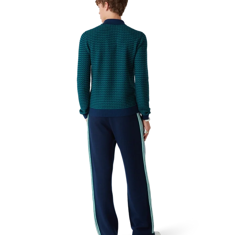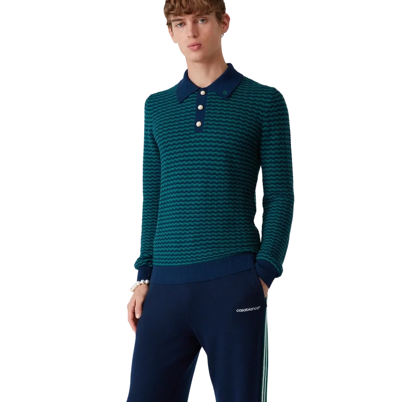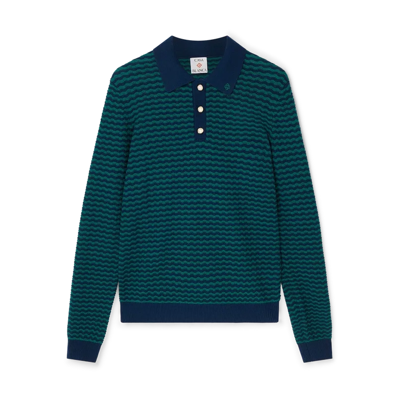 Das Mini Wave Polo-Shirt ist ein klassisches Langarm-Design aus Merinowolle. Mit geripptem Kragen, Ärmelbündchen, Saum, Knopfleiste und charakteristischen goldgerahmten Perlknöpfen.