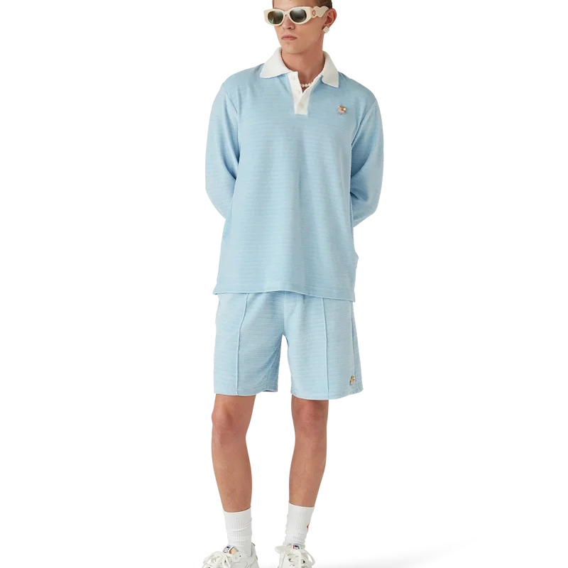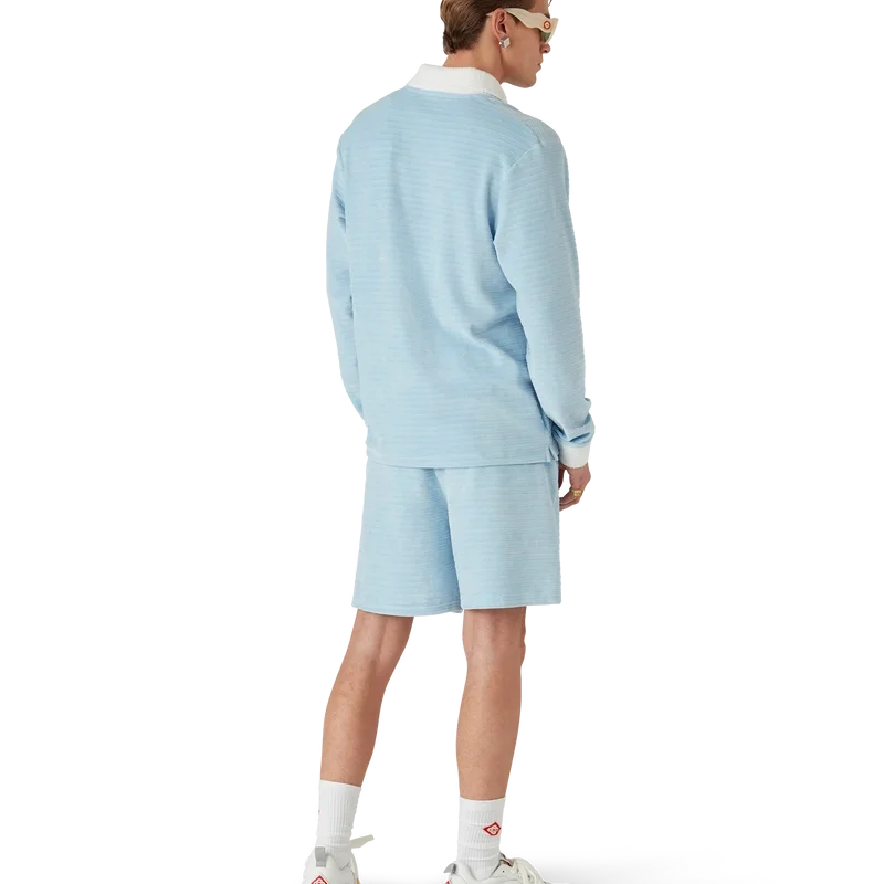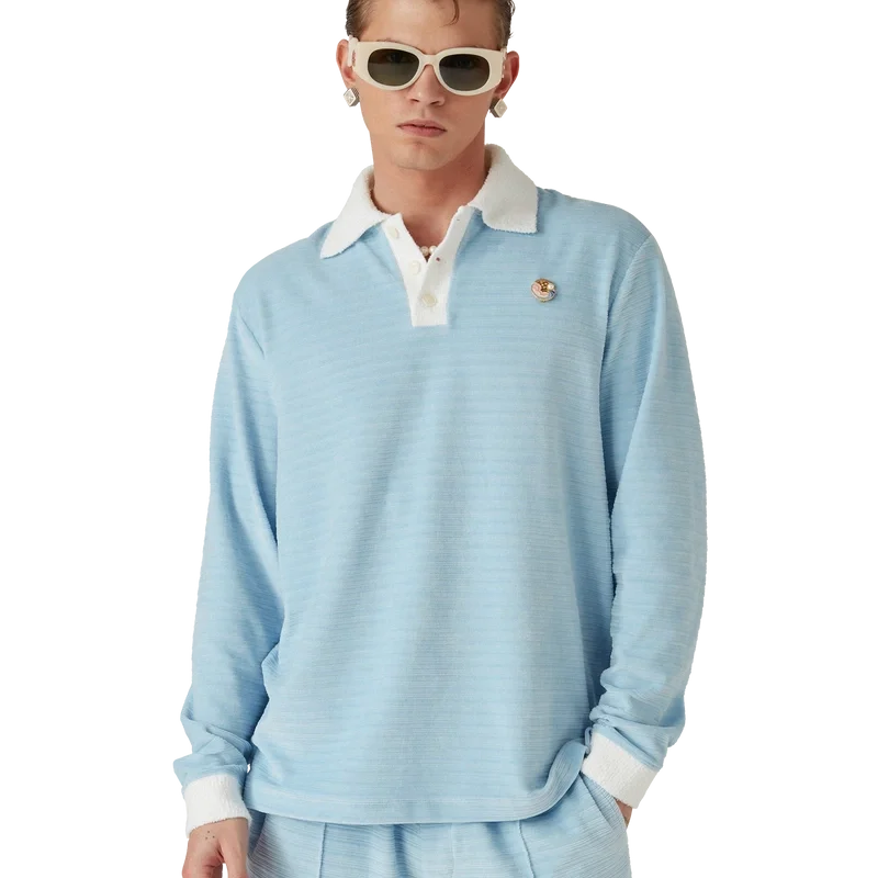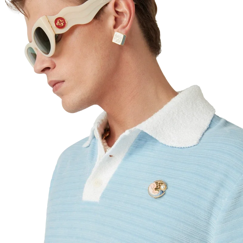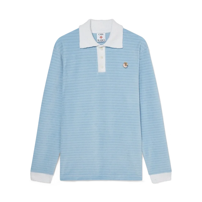 Das Velours-Streifen-Poloshirt ist ein langärmeliges Modell aus gestreiftem Veloursstoff mit dem „Four Elements“-Pin des Hauses. Abgerundet durch Corozo-Knöpfe mit ineinander verschlungenem Cc-Logo, eine Knopfleiste mit drei Knöpfen sowie kontrastierende Rippbündchen an Knopfleiste, Ärmelbündchen und Kragen.