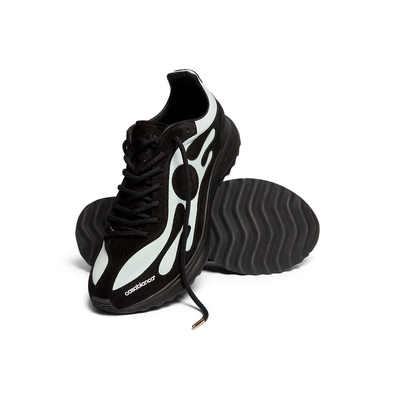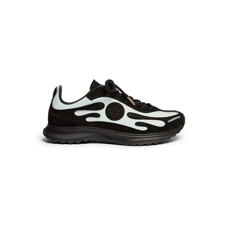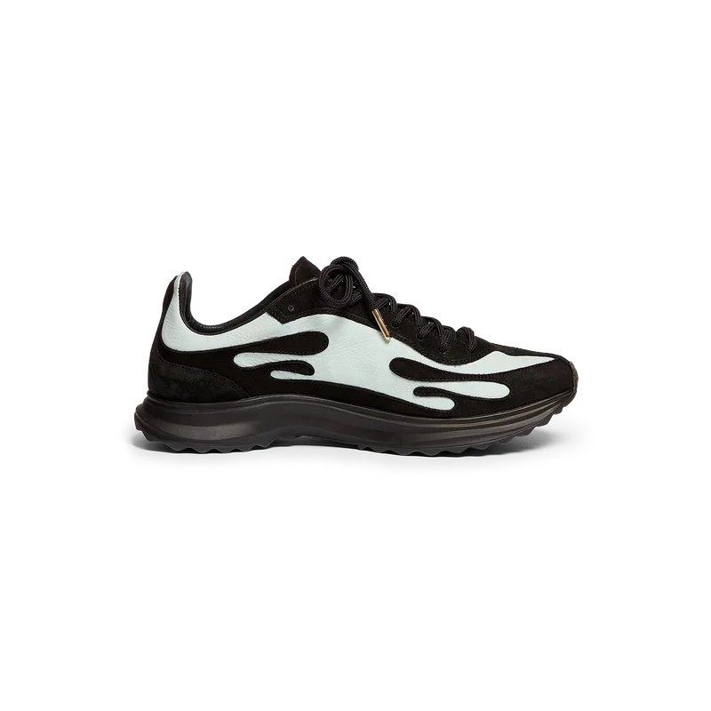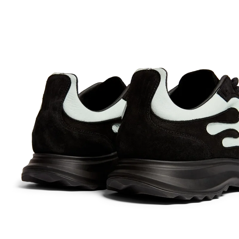 Der Stade Sneaker für Damen in Schwarz und Mint hat seinen Namen von der antiken griechischen Maßeinheit für die Distanz eines Fußrennens, aus der später das Wort „Stadion“ entstand. Der Stil ist von Performance-Schuhen inspiriert und verkörpert die Übertragung moderner Technologie aus alter Tradition. Das Obermaterial des Sneakers besteht aus Leder, die Sohle ist gummiert.