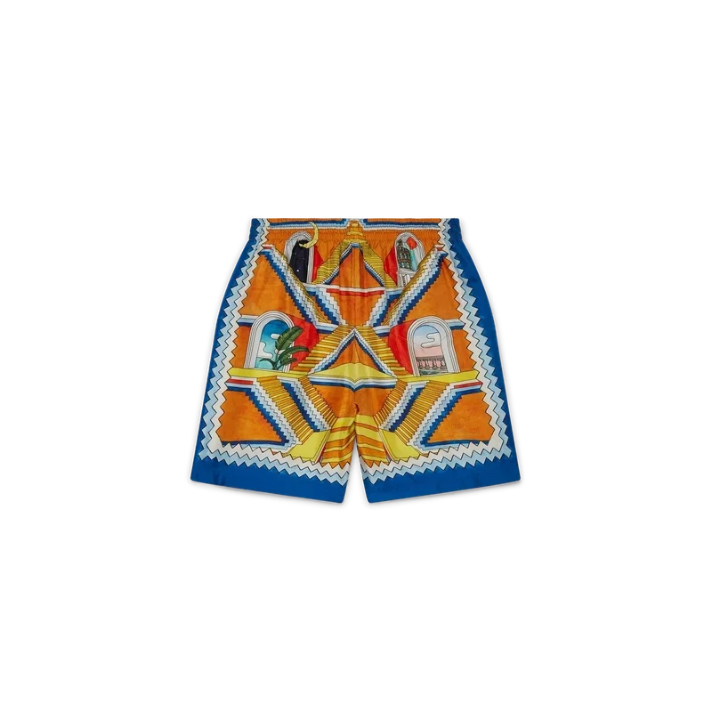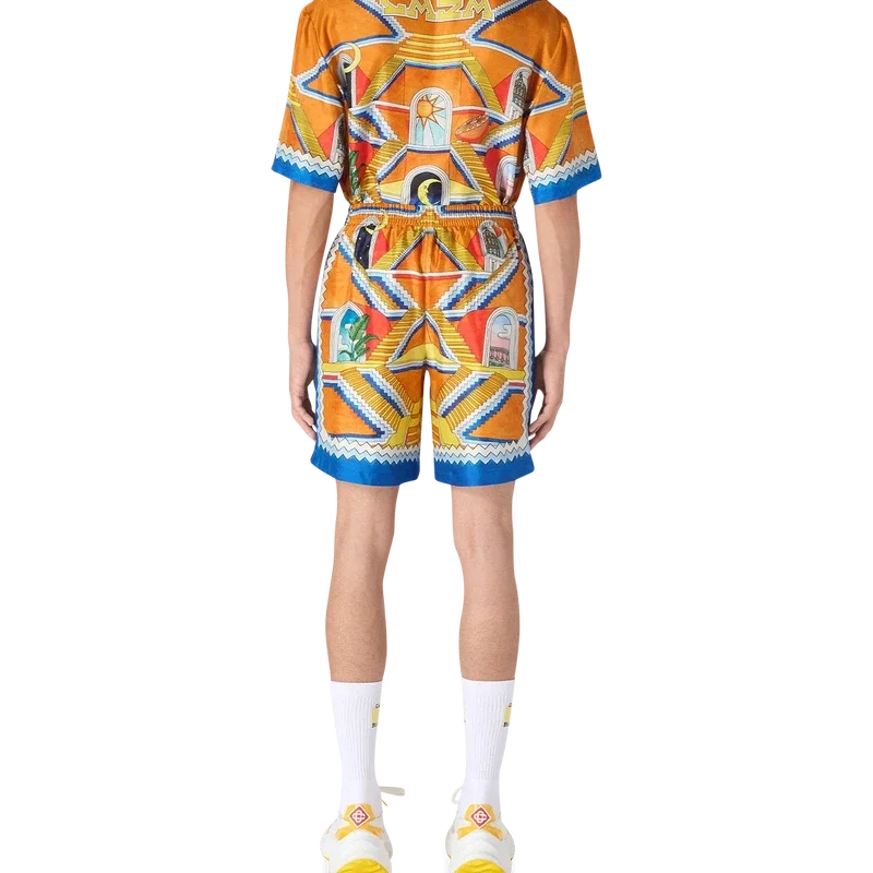 Die Escalier Infini Seidenshorts für Herren zeigen das strahlende, endlose Treppenmotiv dieser Saison. Mit kontrastierendem blau-weißem Zickzack-Saum und Kordelzug in der Taille.