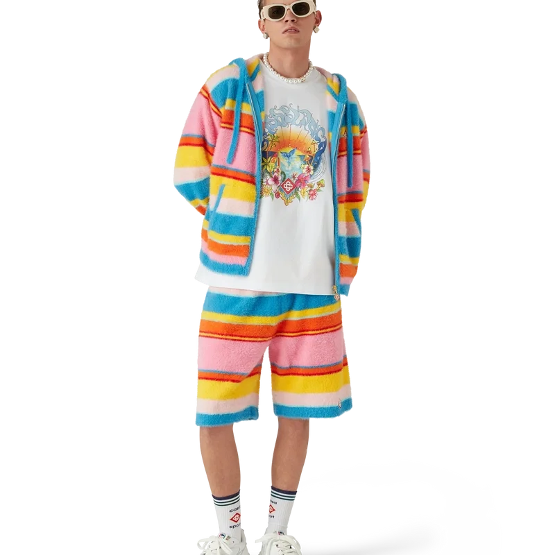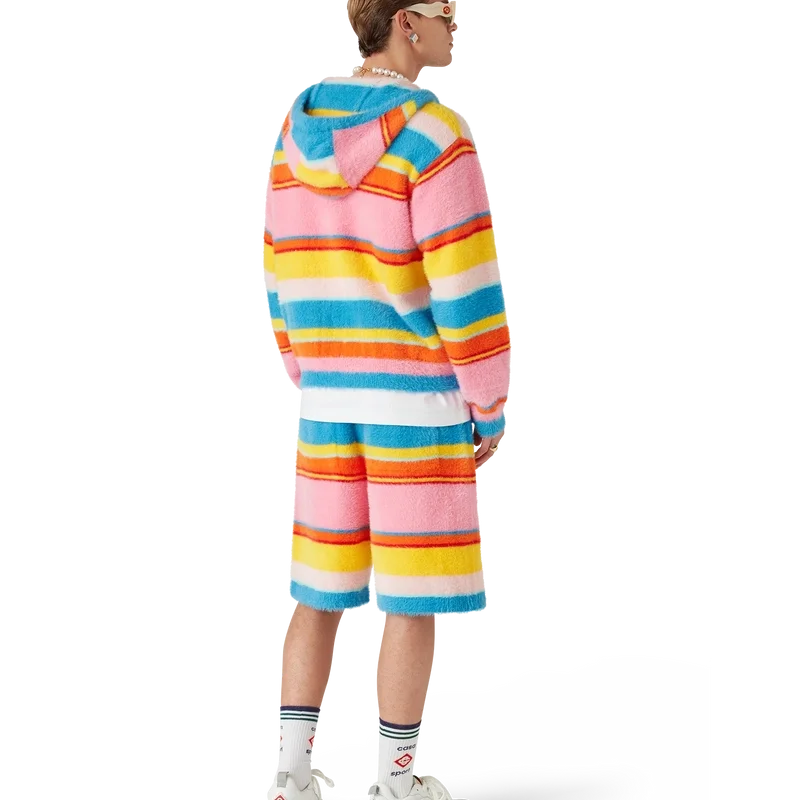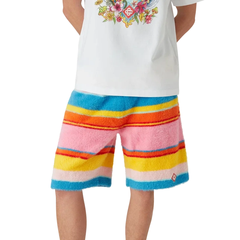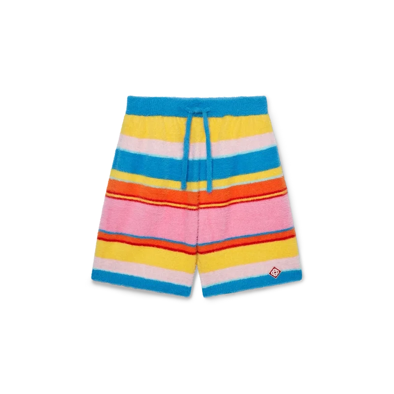 Die flauschigen, gestreiften Oversize-Shorts sind ein knielanges Modell aus gestreiftem, flauschigem Strickstoff. Abgerundet durch das charakteristische Rautenlogo des Hauses, einen elastischen Bund, einen Kordelzug, schräge Vordertaschen und eine aufgesetzte Gesäßtasche.