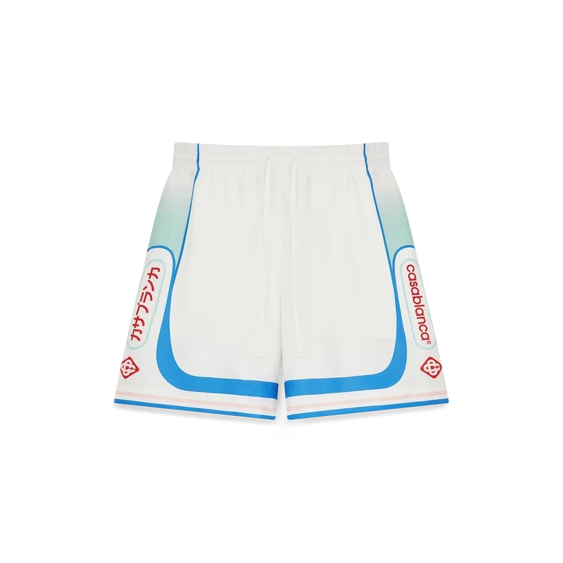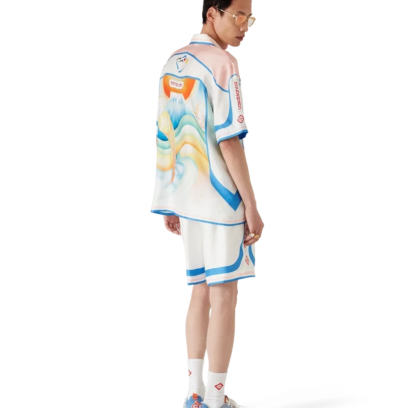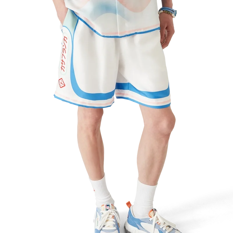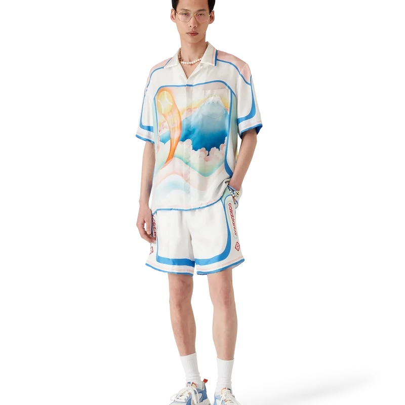 Die Fuji Dream Seidenshorts sind ein bedrucktes Design mit einem Motiv, das eine traumhafte Vision einer Reise zum Fuji zeigt – gefertigt aus Seidentwill. Mit elastischem Bund, Seitentaschen in der Naht, einer Gesäßtasche, gestreiften Details am Saum und einem Motiv an den Seiten.