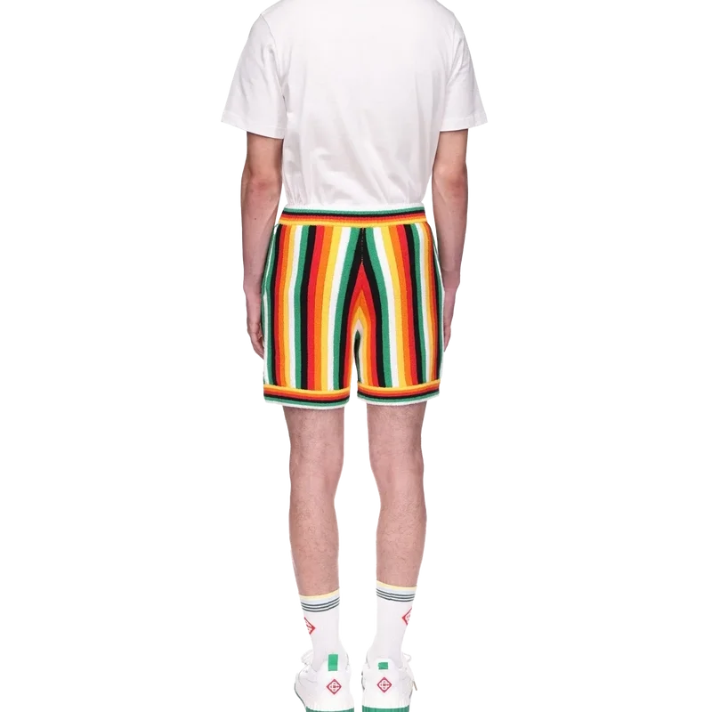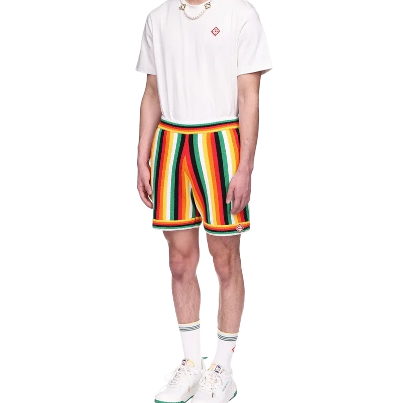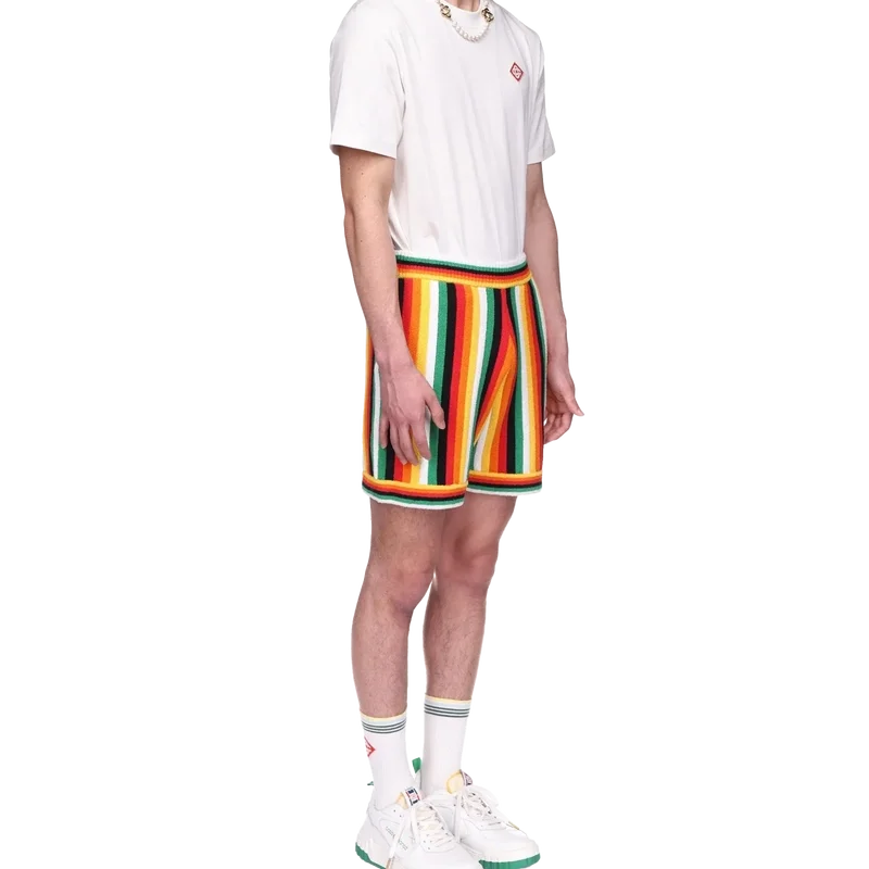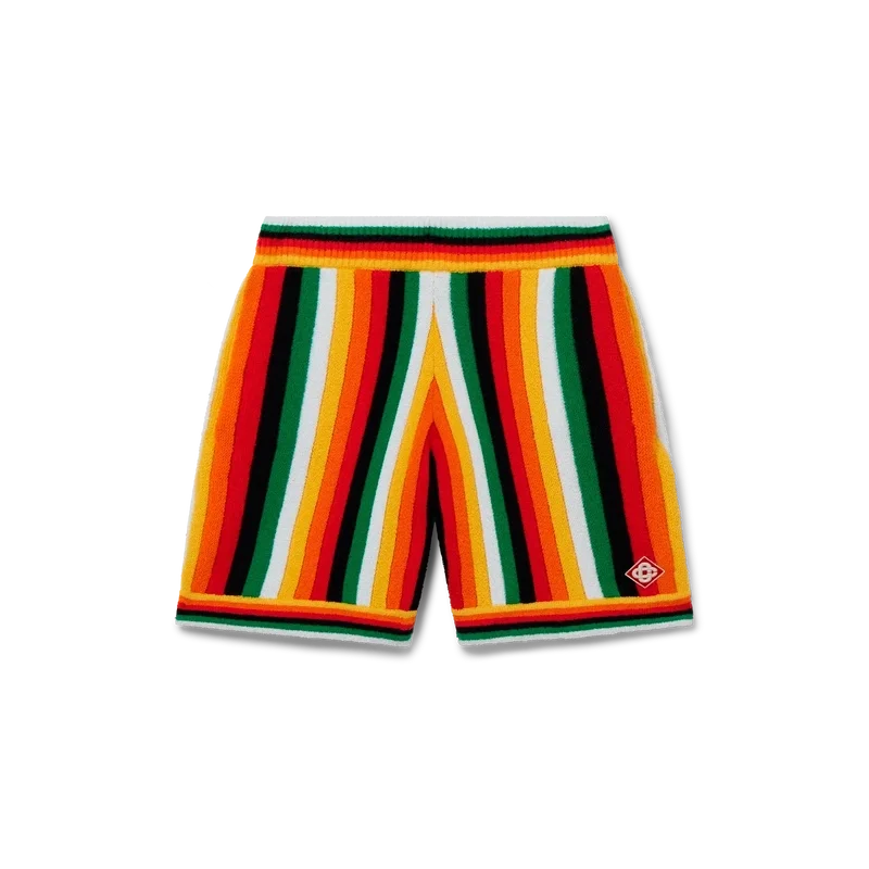 Die gestreiften Frottee-Shorts sind ein Strickdesign aus einem Frotteestoff aus Baumwollmischung und präsentieren die Farben der Saison, die für den reichen Austausch zwischen den kulturellen Disziplinen in der afrikanischen Kunst, Musik und im Film stehen. Abgerundet durch einen elastischen Bund, Seitentaschen und den charakteristischen Diamant-Logo-Aufnäher des Hauses.