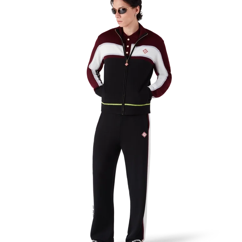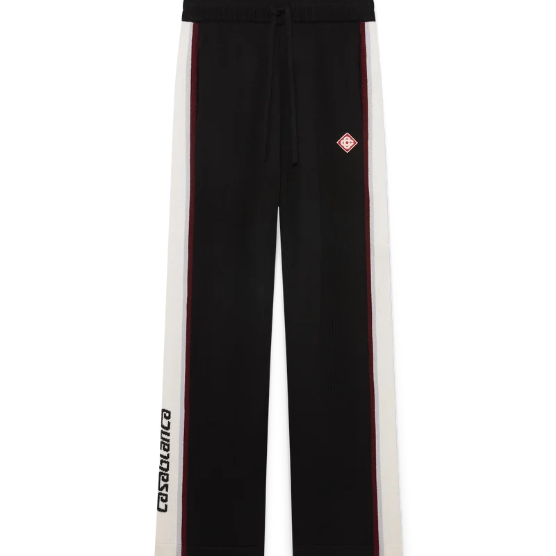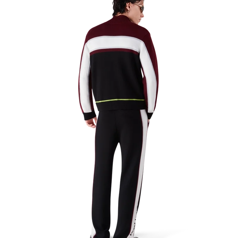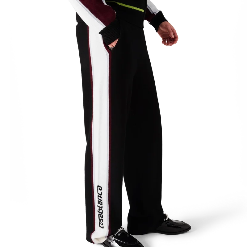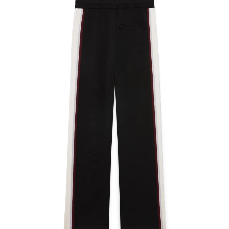 Die gestreifte Merino-Hose besticht durch ihr raffiniertes Design aus Merinowolle mit strukturierter Strickoptik. Sie verfügt über einen elastischen Bund und eine lockere Silhouette, die sportliche Lässigkeit mit raffinierter Schneiderkunst verbindet.