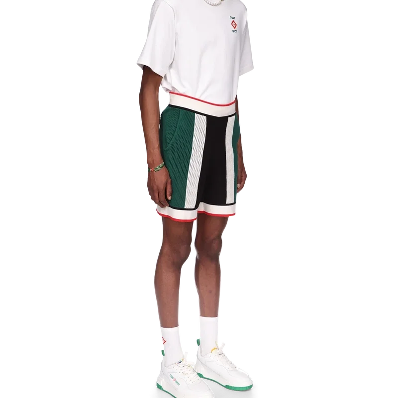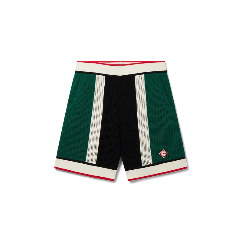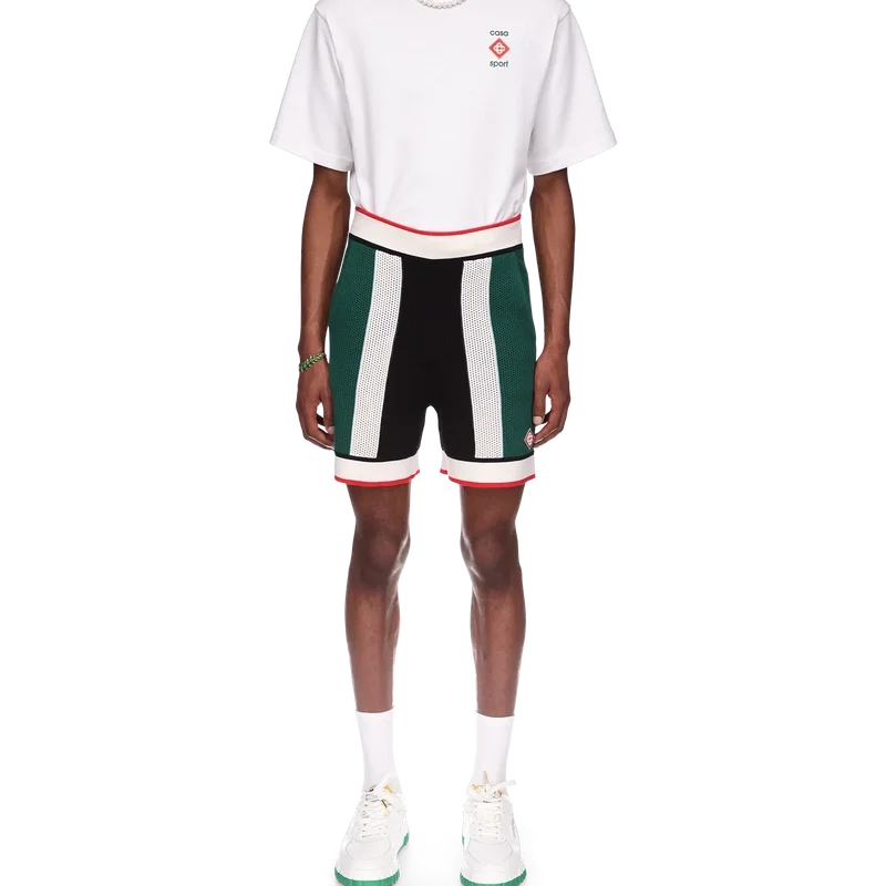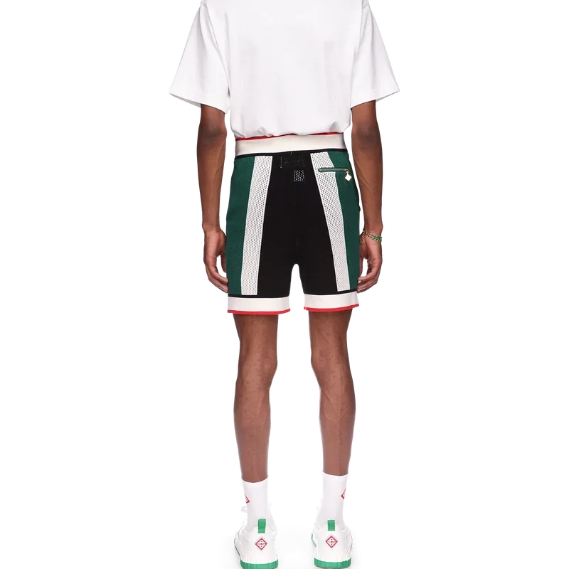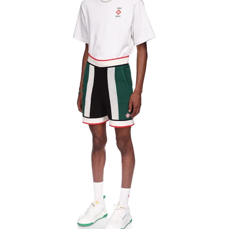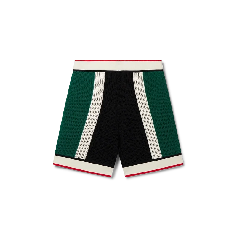 Die gestreiften Mesh-Shorts sind aus einem gestrickten Bio-Baumwollstoff gefertigt, von den Farben der nigerianischen Flagge inspiriert und mit dem Diamond-Logo-Patch des Hauses versehen. Abgerundet durch einen gerippten Bund und Saum, schräge Seitentaschen und eine Gesäßtasche mit Reißverschluss.