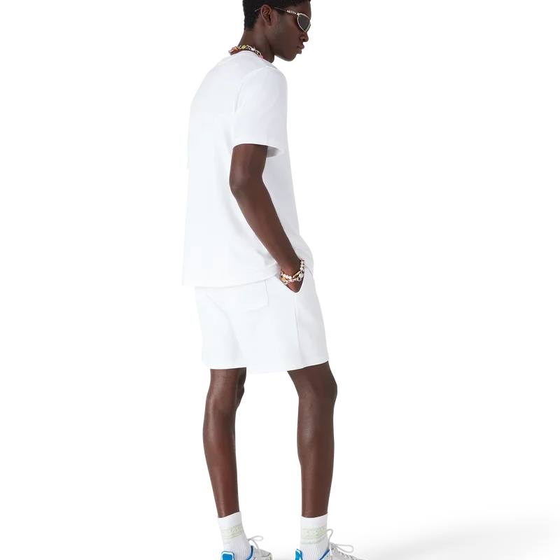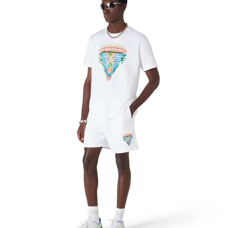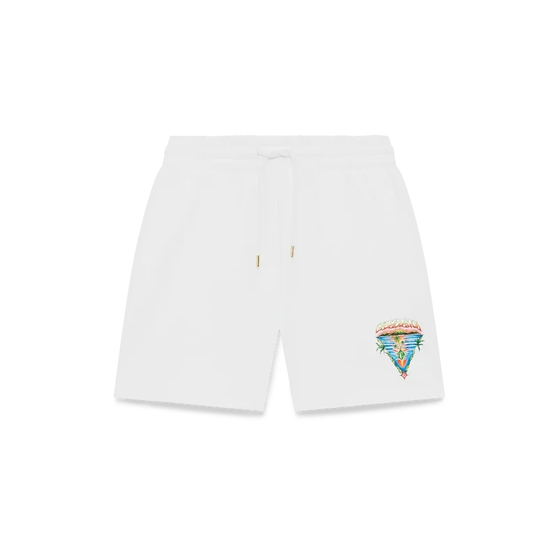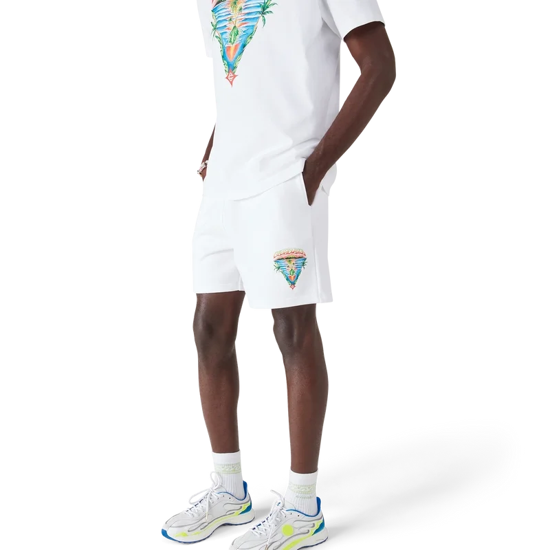 Die Innocence Triangle Sweatshorts zeichnen sich durch ein raffiniertes Design aus, das eine Meereslandschaft bei Sonnenuntergang mit einer Insel im Zentrum zeigt, dargestellt in einem Stil, der von klassischer Surf-T-Shirt-Kunst beeinflusst ist. Das Motiv fängt die ätherische Schönheit der goldenen Stunde über tropischen Gewässern ein und präsentiert eine idealisierte Vision eines Strandparadieses durch die raffinierte Sport- und Freizeit-Perspektive des Hauses.
