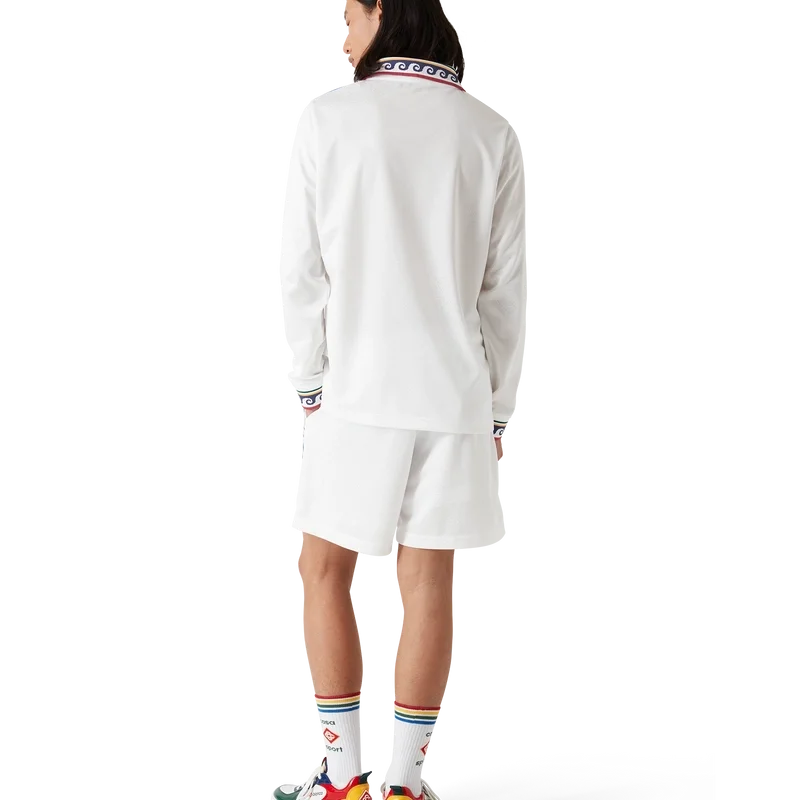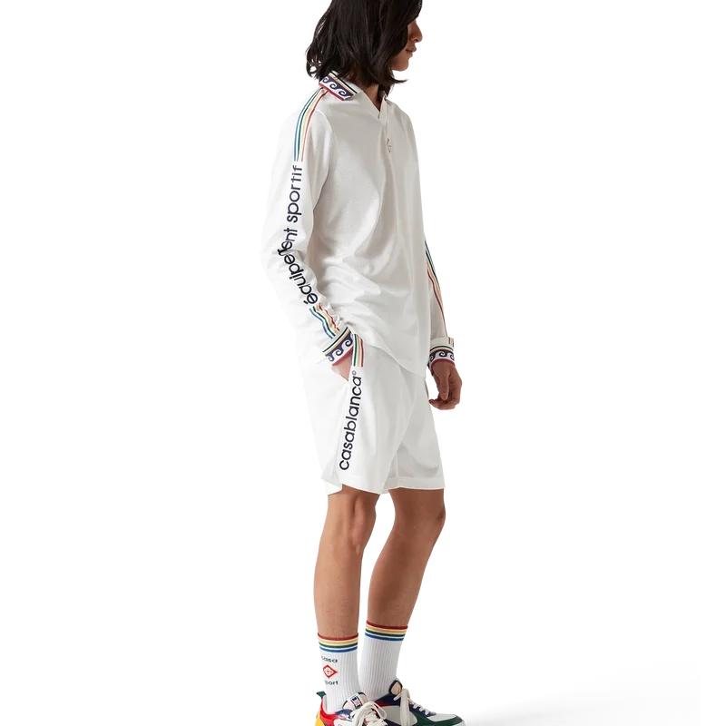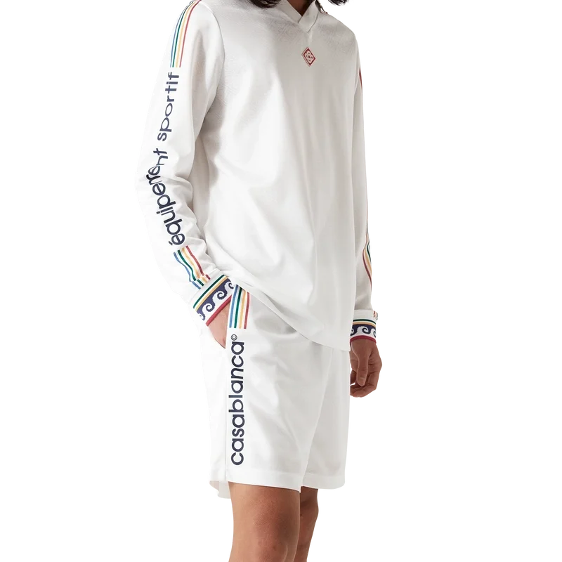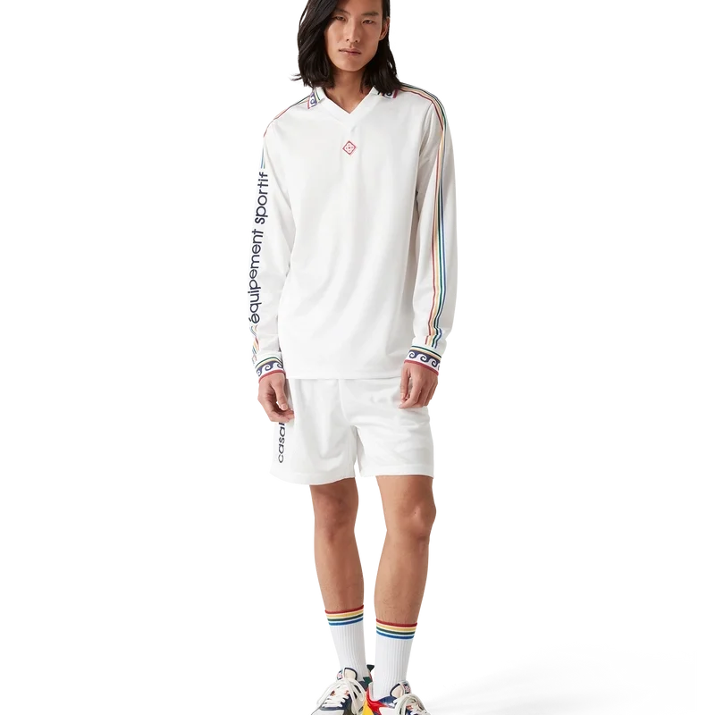 Die Jacquard-Monogramm-Fußballshorts sind ein Sportbekleidungsmodell aus einem Jacquard-Monogramm-Polyestergewebe, das an der Seite mit dem charakteristischen Casablanca-Logo des Hauses verziert ist. Abgerundet durch einen elastischen Bund mit Kordelzug und seitlichen Eingrifftaschen.