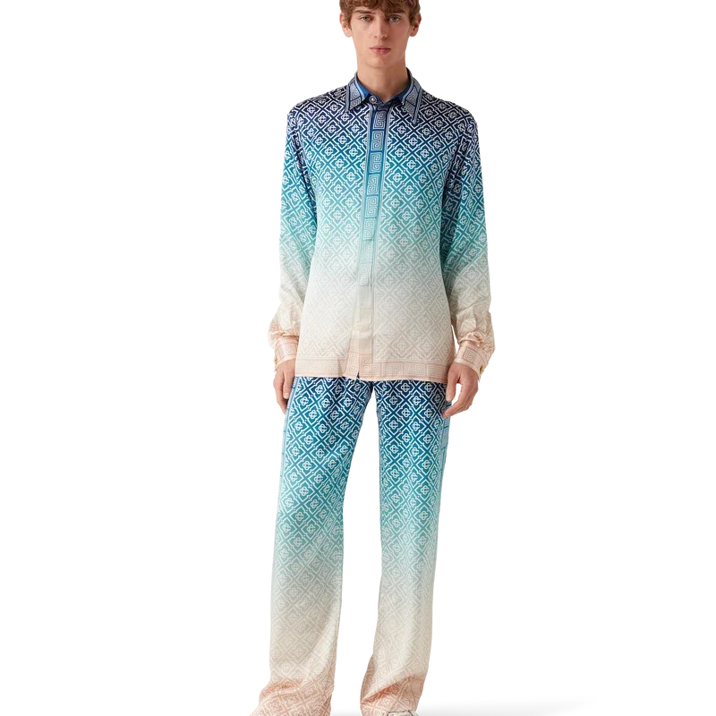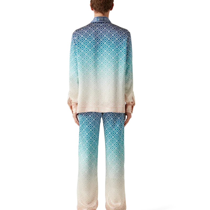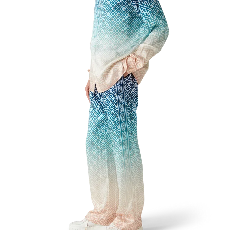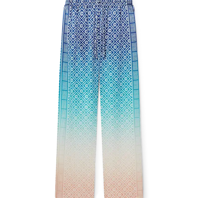 Die Jacquard-Seiden-Hose mit Farbverlauf ist ein durchgehend bedrucktes Modell mit dem charakteristischen Monogramm des Hauses, gefertigt aus Seidensatin. Mit elastischem Bund, Seitentaschen und Futter.