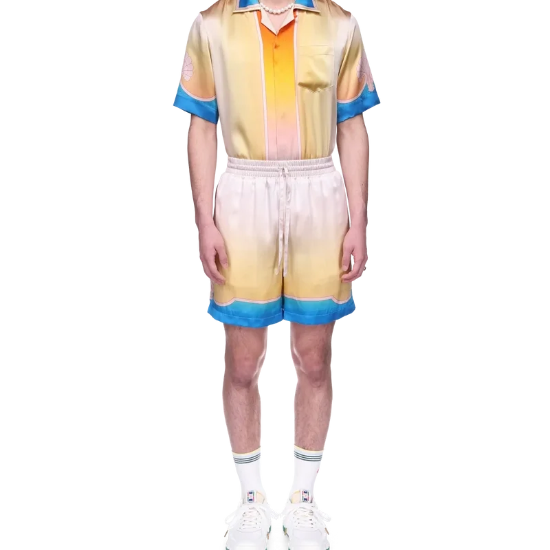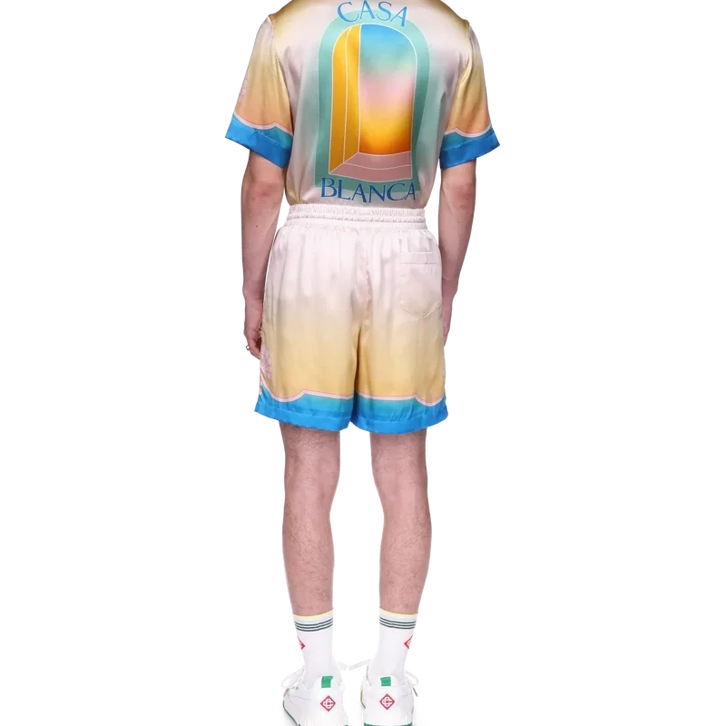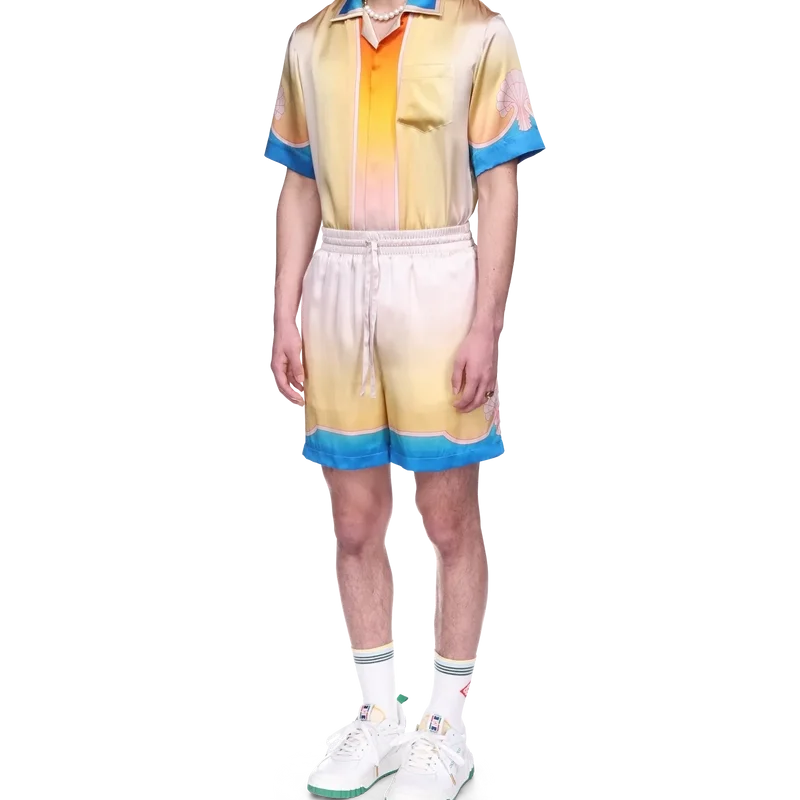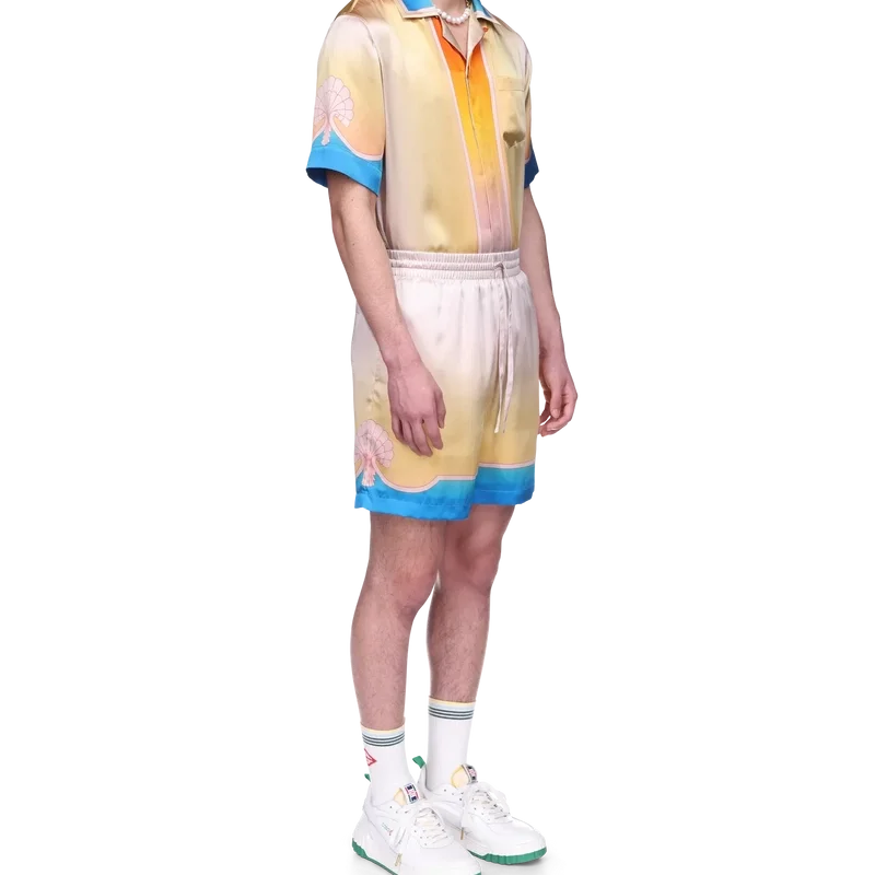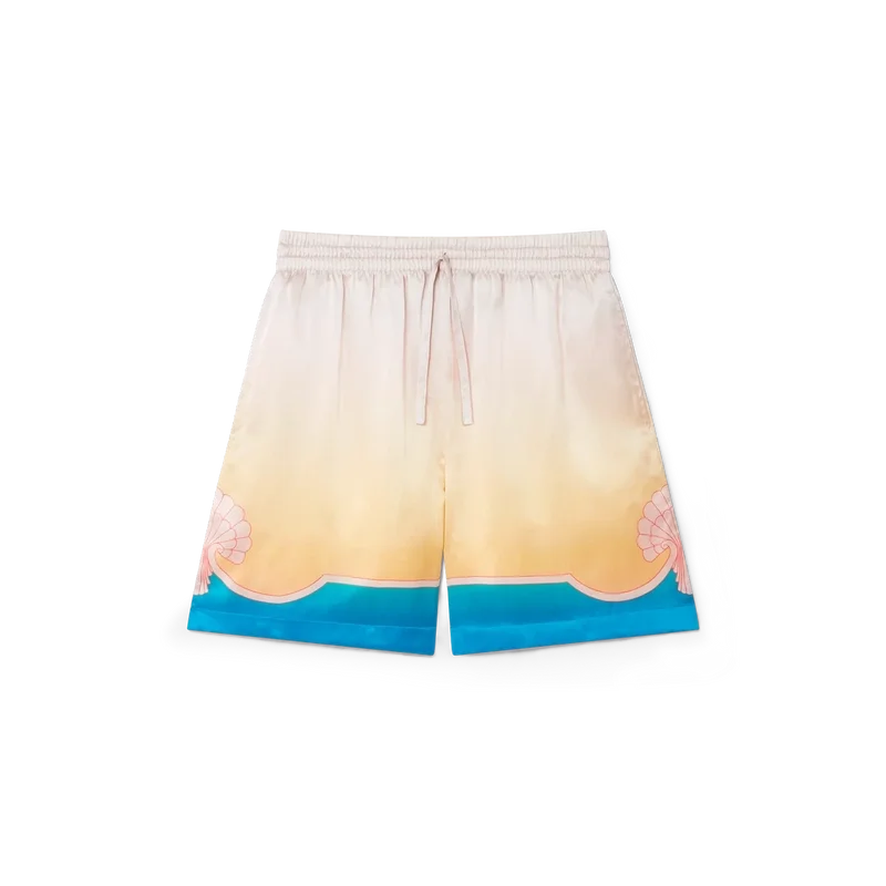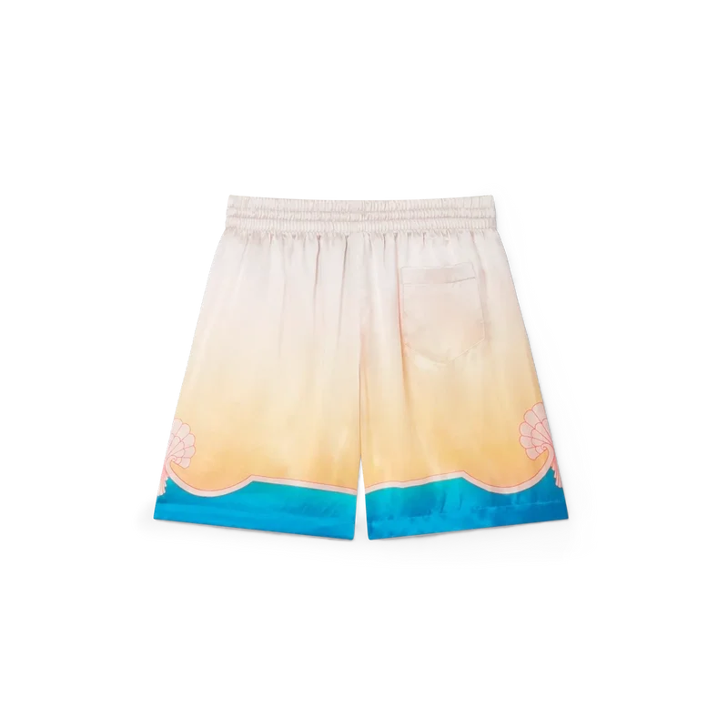 Die L’arc Colora Seidenshorts sind ein bekanntes Design aus bedrucktem Seidensatin und zeigen den charakteristischen Farbverlaufsdruck sowie Muschelmotive des Hauses. Die Farbpalette dieser Kollektion ist hell und idealistisch und unterstreicht die für unsere Marke zentralen, ätherischen Themen. Abgerundet durch Streifenverzierungen am Saum, die sich zu Muschelmotiven formen, einen elastischen Bund mit Kordelzug, Seitentaschen und eine Gesäßtasche.
