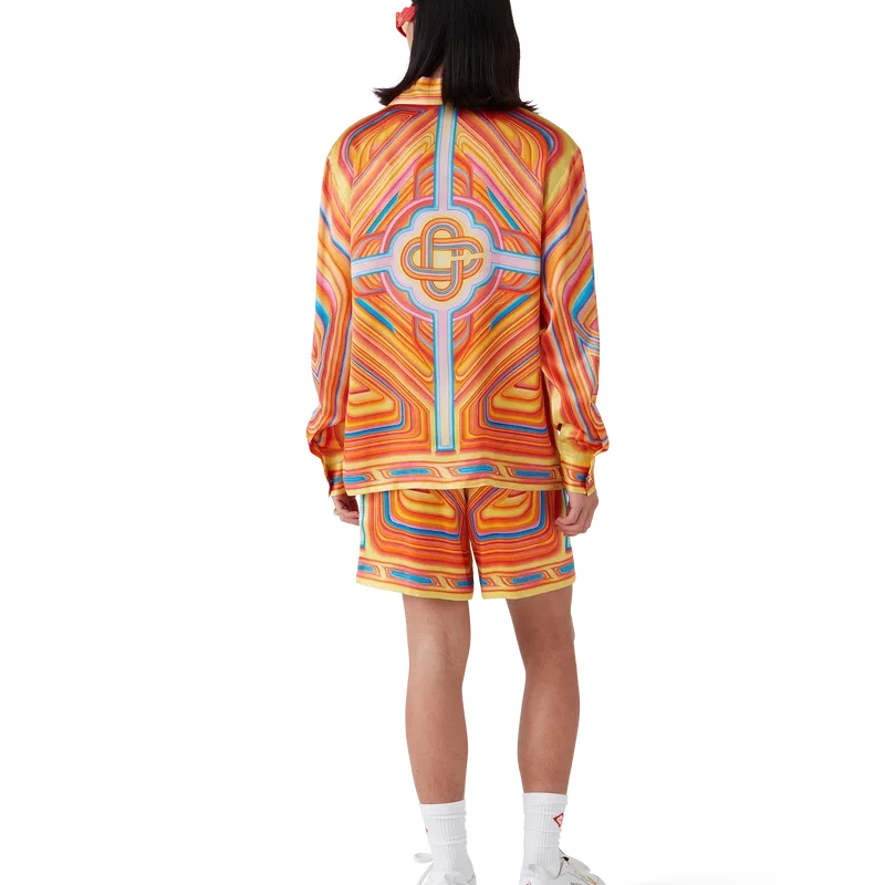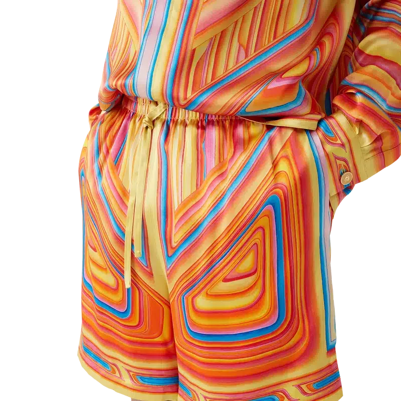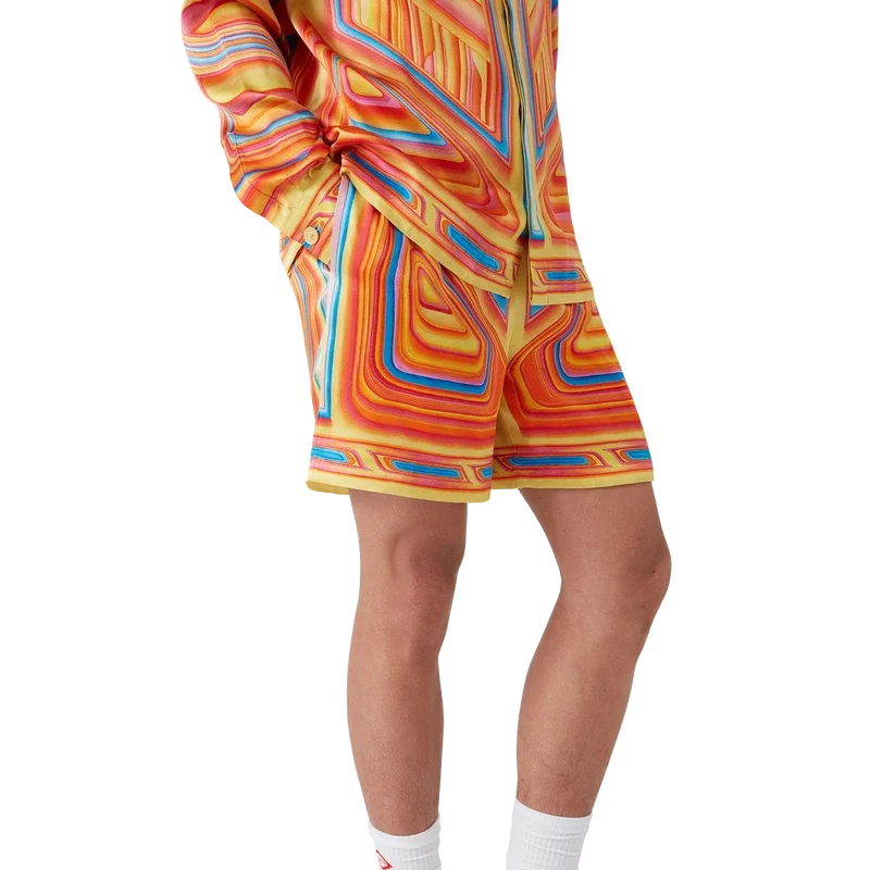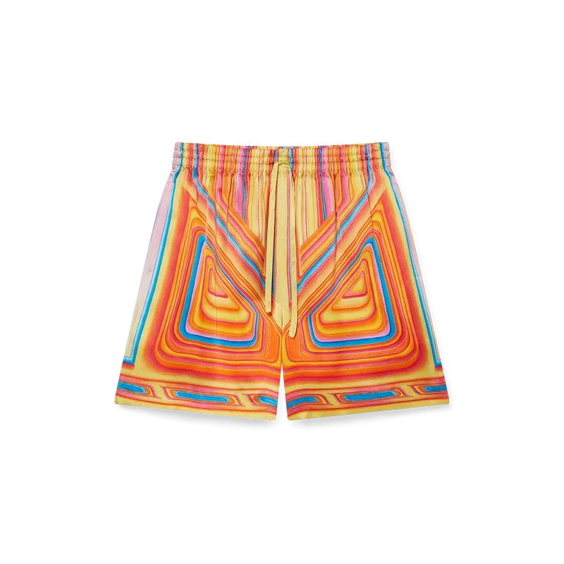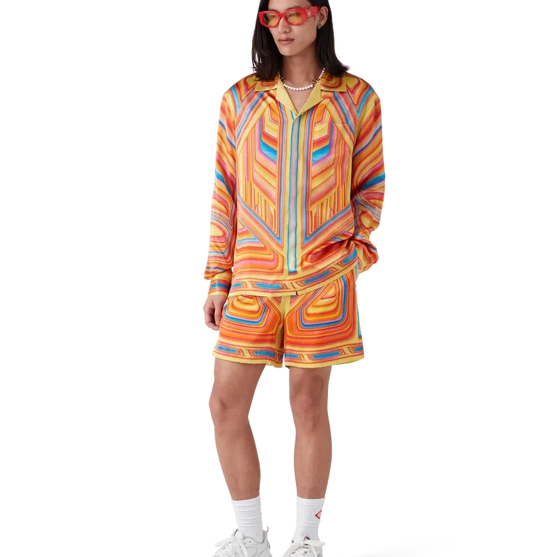 Die Low Rider Seidenshorts sind ein durchgehend bedrucktes Design aus Seidensatin, das das saisonale Artwork des Hauses zeigt, das sich auf die knalligen Farben und Airbrush-Maltechniken von Low-Rider-Autos bezieht, ergänzt durch das Casablanca-Logo. Abgerundet durch einen elastischen Bund, Seitentaschen in den Beinen, eine aufgesetzte Gesäßtasche, einen Kordelzugverschluss und ein Futter.