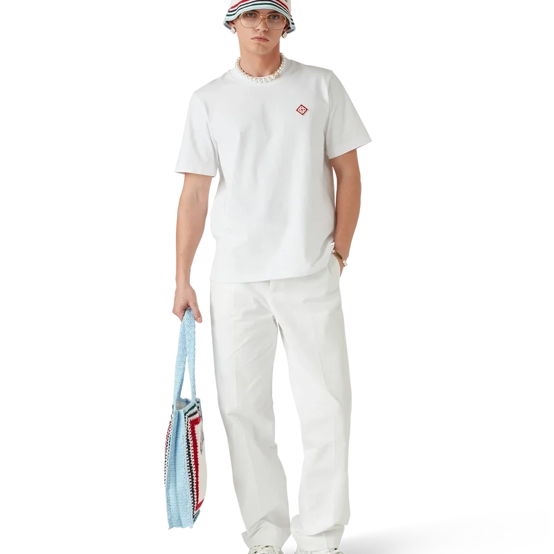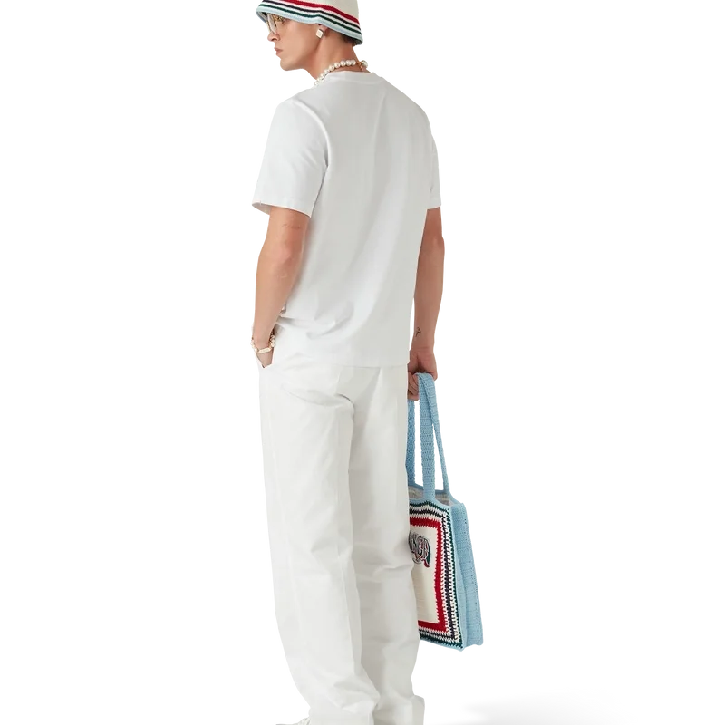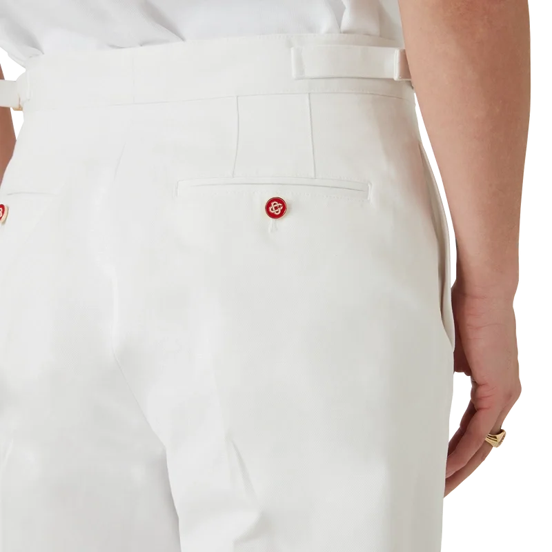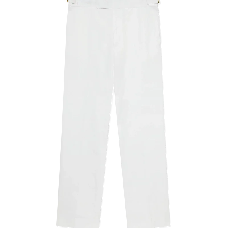 Die maßgeschneiderte Chino-Hose hat ein gerades Bein, ist aus Baumwollstoff gefertigt und verfügt über ein Baumwollfutter. Abgerundet wird sie durch Nahttaschen, einen Reißverschluss, seitliche Weitenregler mit vergoldeten Schnallen und Gesäßtaschen mit Knopfverschluss.