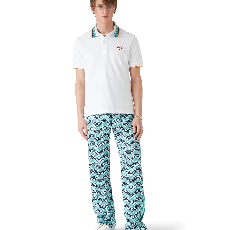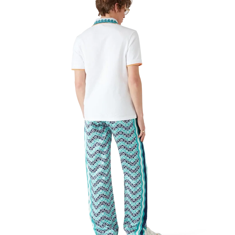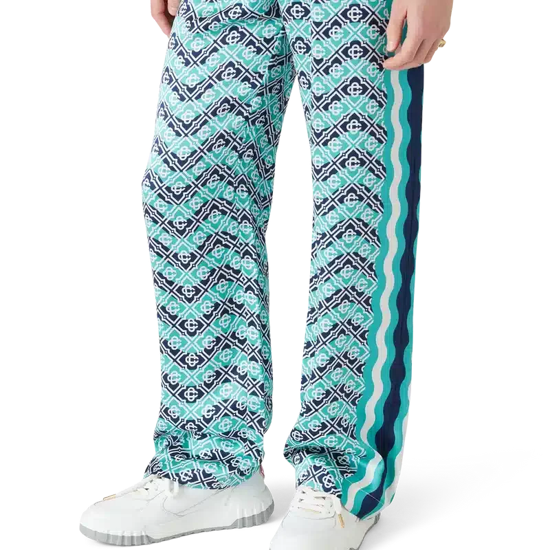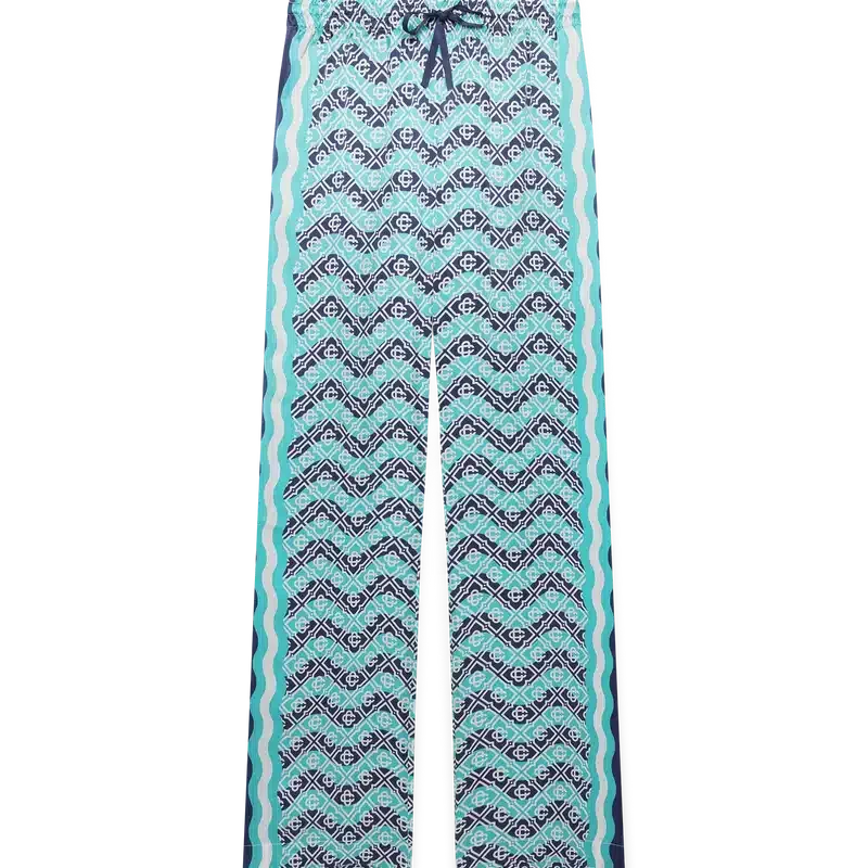 Die Monogram Wave Seiden-Hose ist ein durchgehend bedrucktes Modell mit dem charakteristischen Monogram des Hauses, gefertigt aus Seidensatin. Mit elastischem Bund, Kordelzug, von der Memphis-Welle inspirierten Streifendetails an den Seiten und seitlichen Eingrifftaschen.